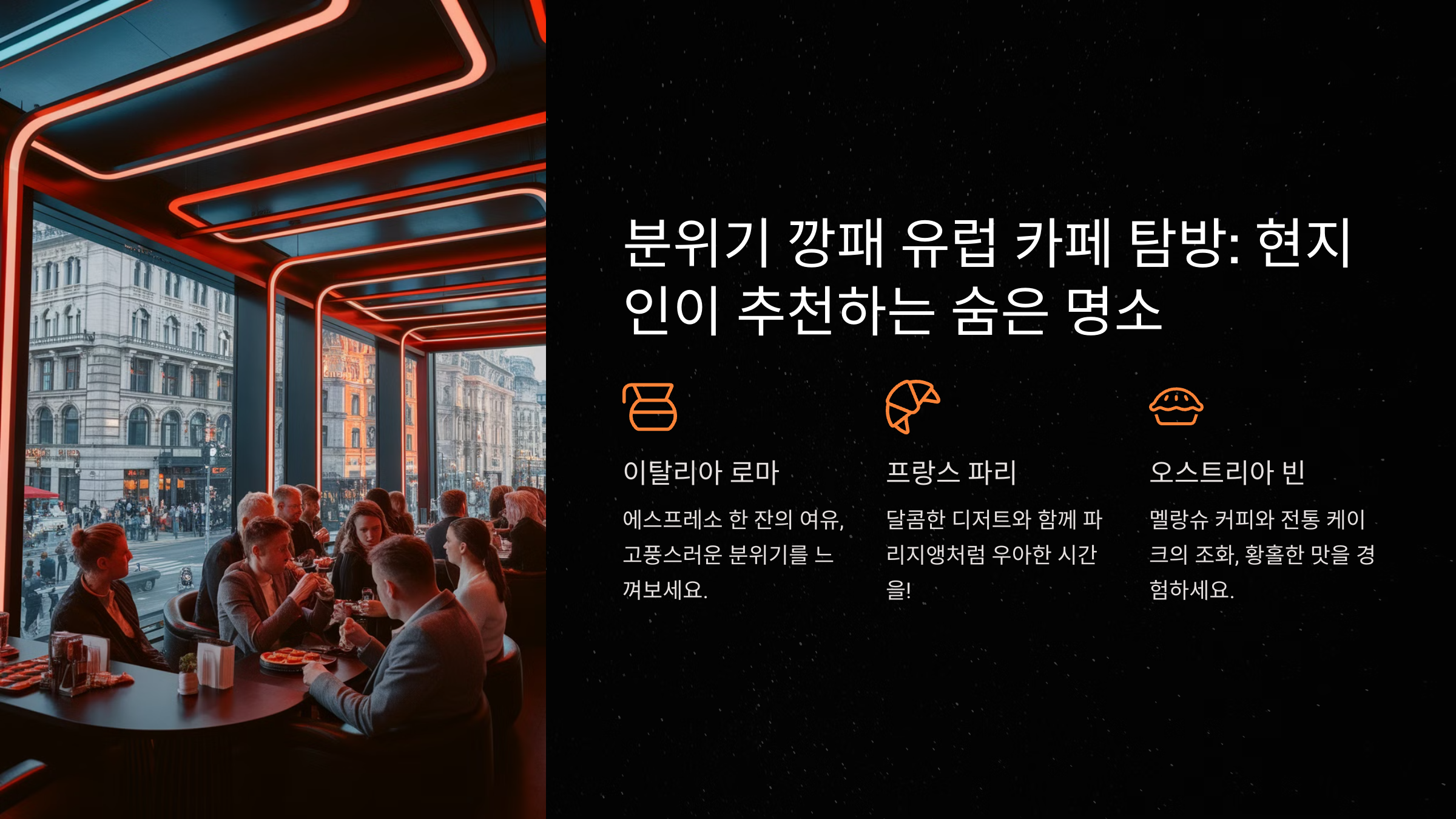 유럽 여행에서 빠질 수 없는 게 바로 감성 카페 투어죠! 커피 한 잔과 함께 여유를 즐길 수 있는 곳들이 유럽 곳곳에 숨어 있어요. 어떤 곳은 100년 넘은 전통을 자랑하고, 또 어떤 곳은 예술가들이 사랑한 공간이기도 해요.