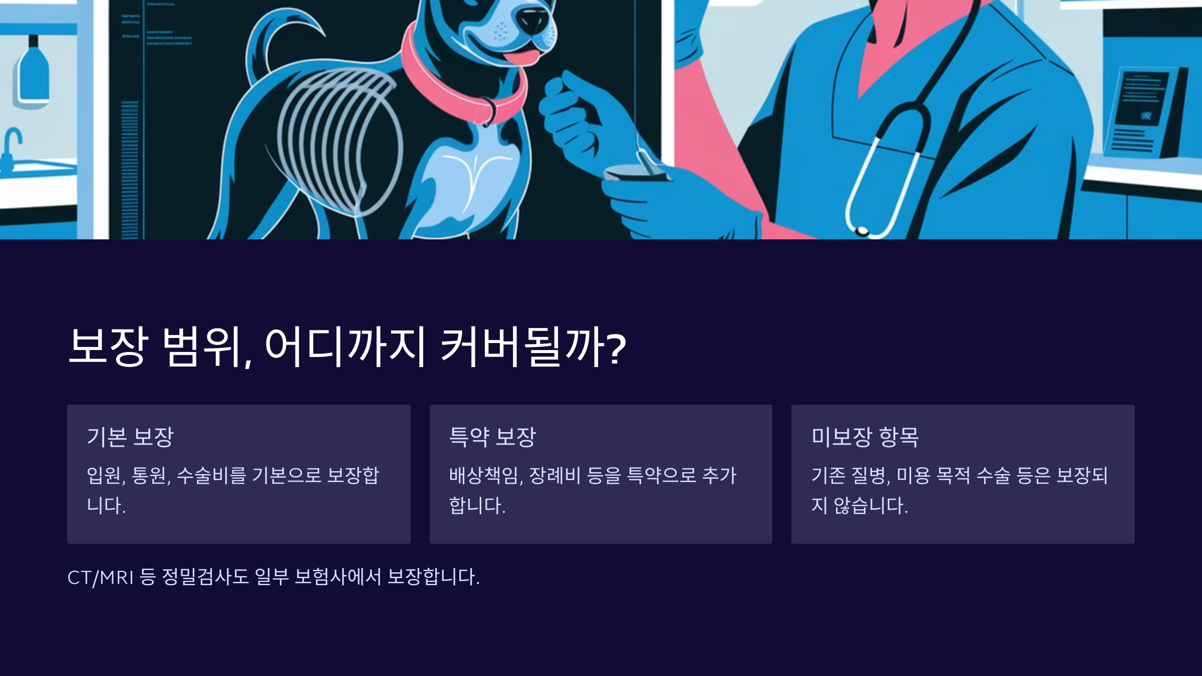| 🚫 보장 제외 항목 | 선천적 질환, 예방 접종, 중성화 수술 등은 대부분 보장되지 않아요. |