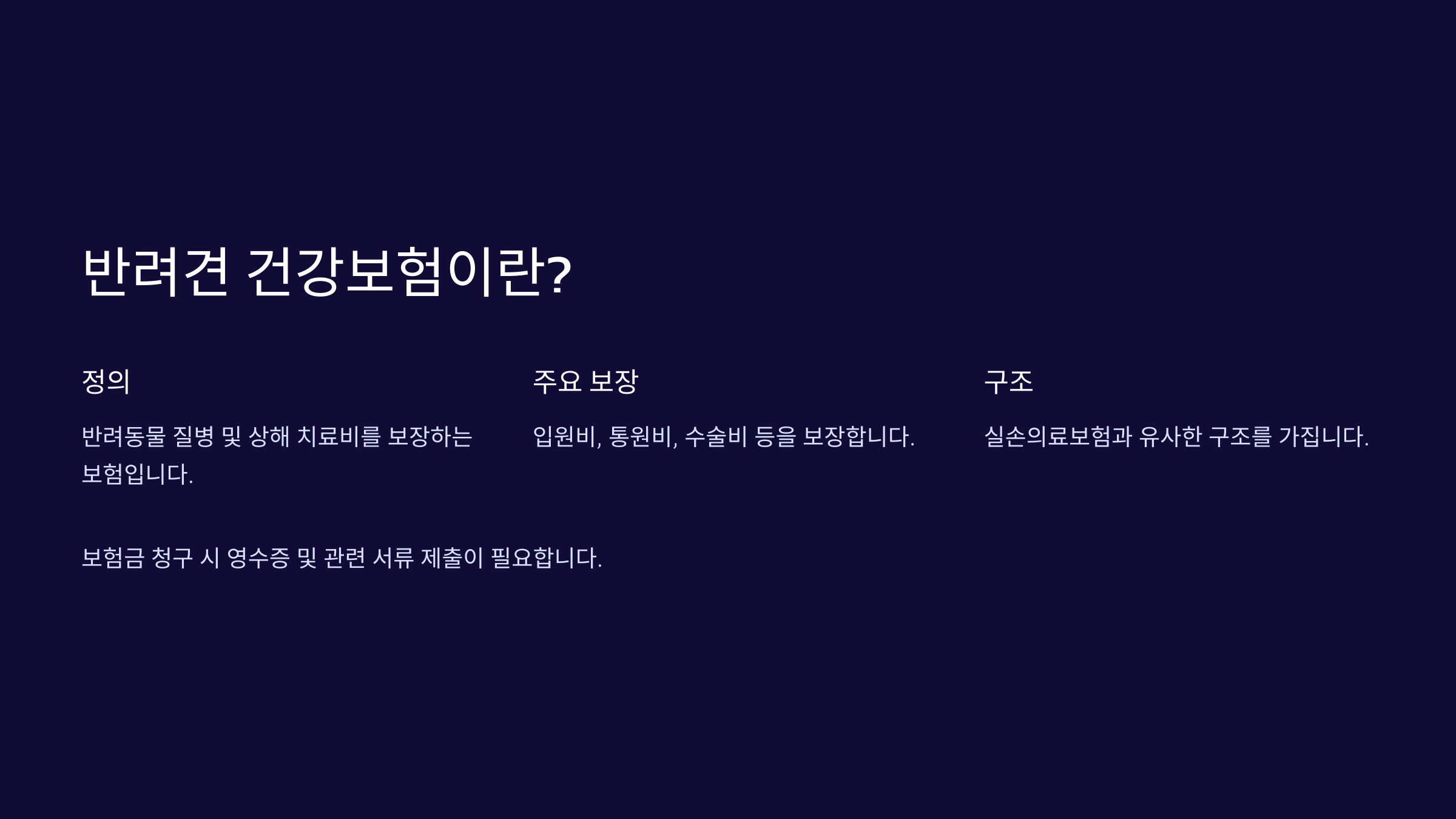 | 💰 자기 부담금 | 보험금 청구 시 일부 금액은 보호자가 부담해야 해요. |
