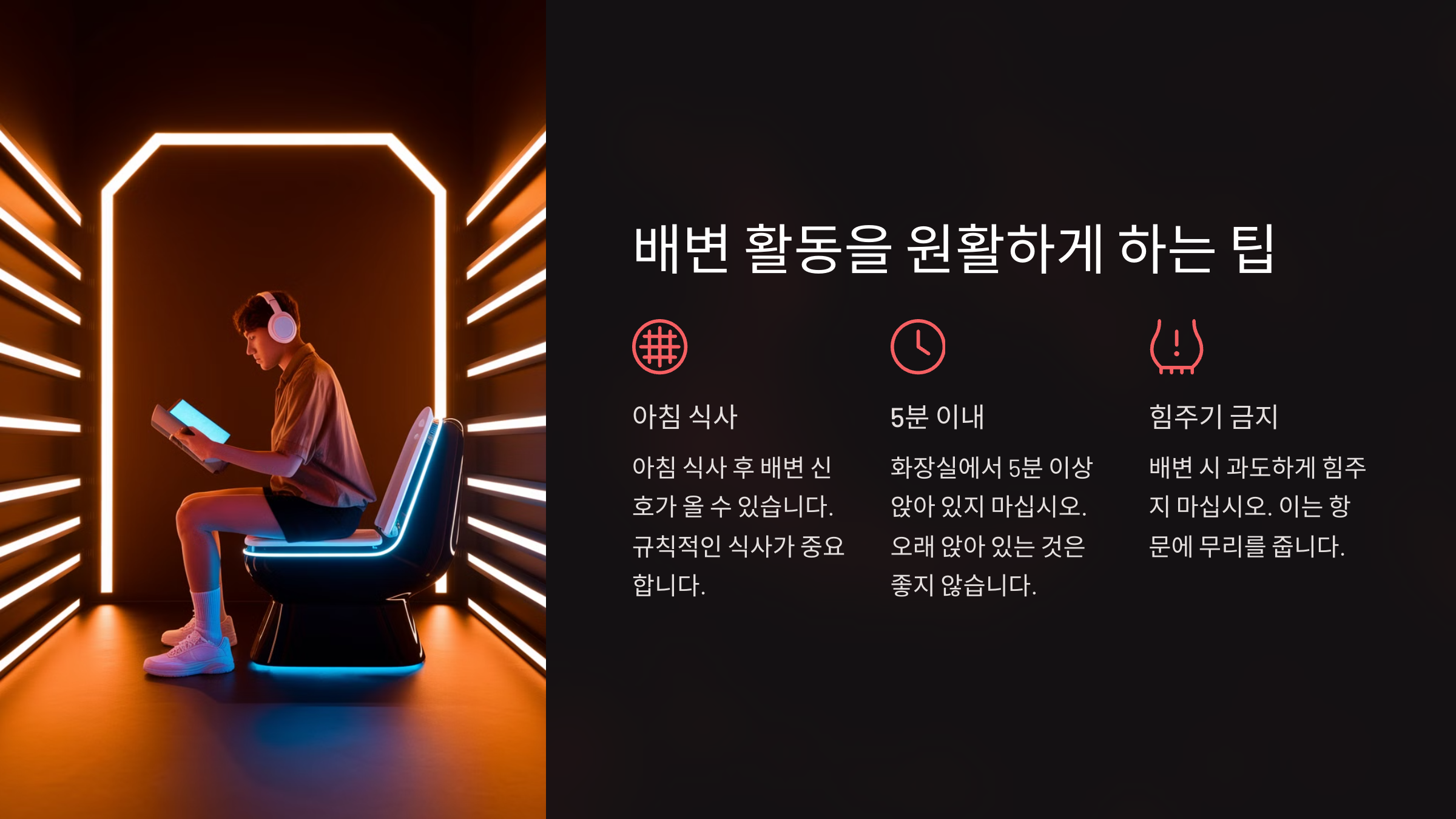 아침 식사 후 30분 이내에 화장실을 가는 습관을 들이면 좋아요. 이 시간대에 장운동이 가장 활발하기 때문에 자연스럽게 배변이 원활해질 수 있답니다.
