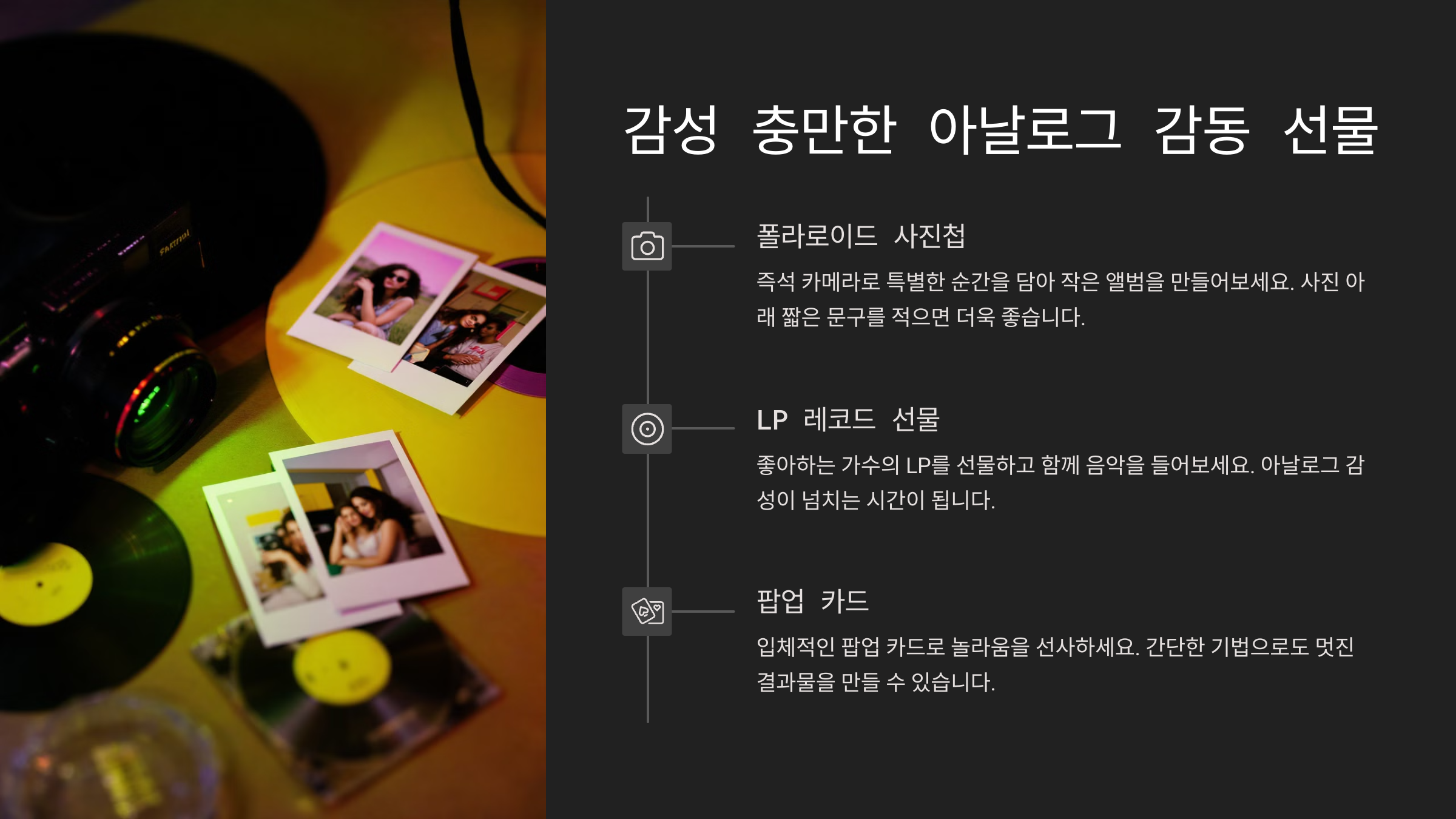 아날로그 감성 선물은 단순한 물건이 아니라 추억을 담아 오래 간직할 수 있는 특별한 선물이에요! 🎁