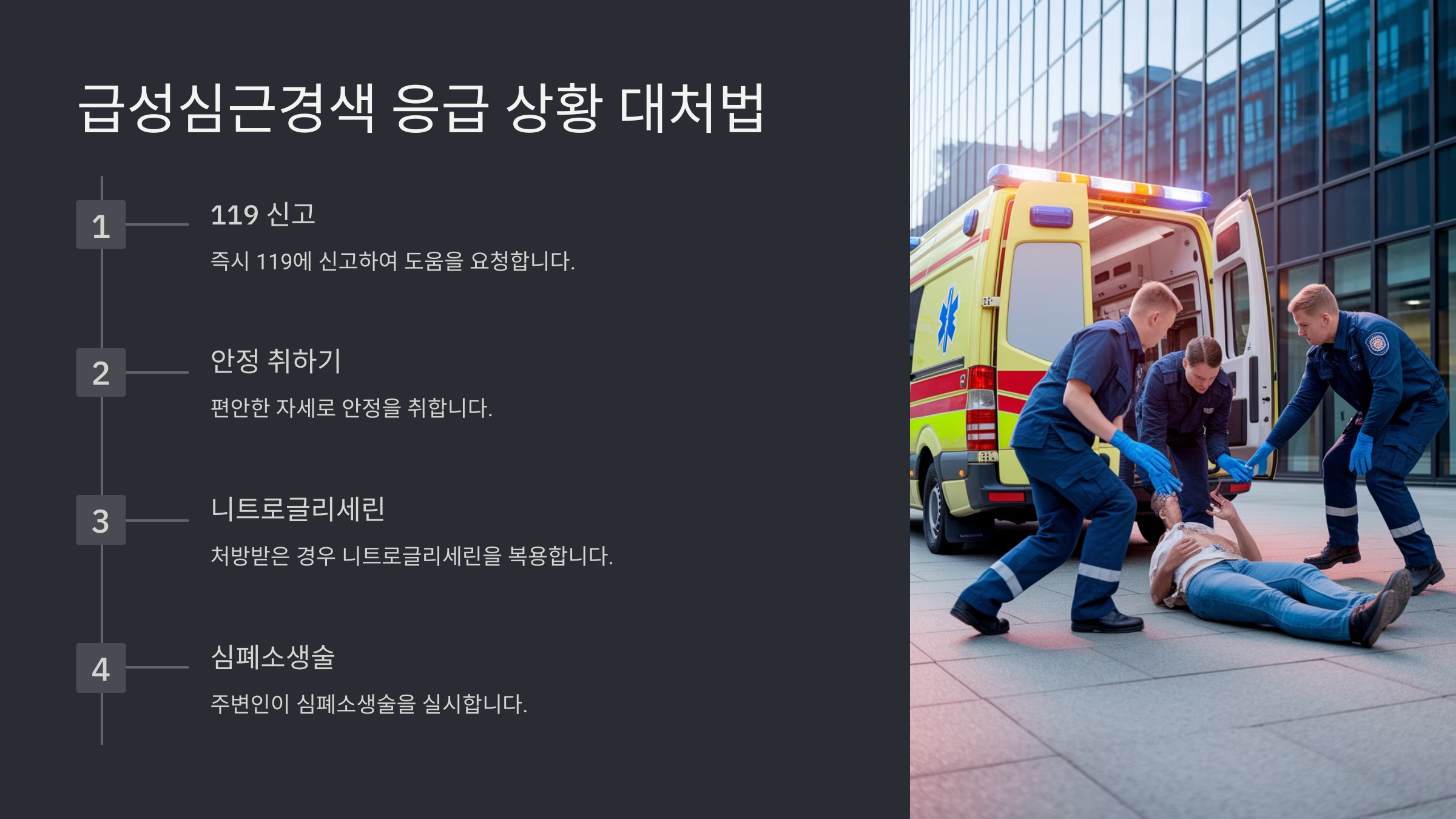 급성심근경색은 심장으로 가는 혈류가 갑자기 차단되어 심장 근육이 괴사하는 치명적인 질환이에요. 단 5분 안에 적절한 조치를 취하지 않으면 생명을 잃을 수도 있어요. 🚨