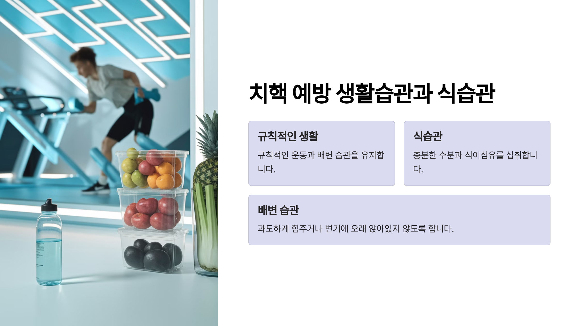 | 🚰 수분 섭취 | 하루 1.5~2L의 물을 마셔 변을 부드럽게 유지 |