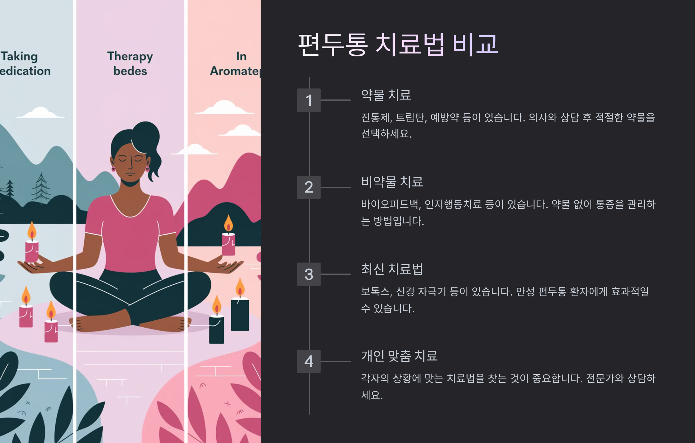 | 💊 약물 치료 | 빠른 효과, 즉각적인 통증 완화 | 내성, 부작용, 약물 과용 두통 위험 |