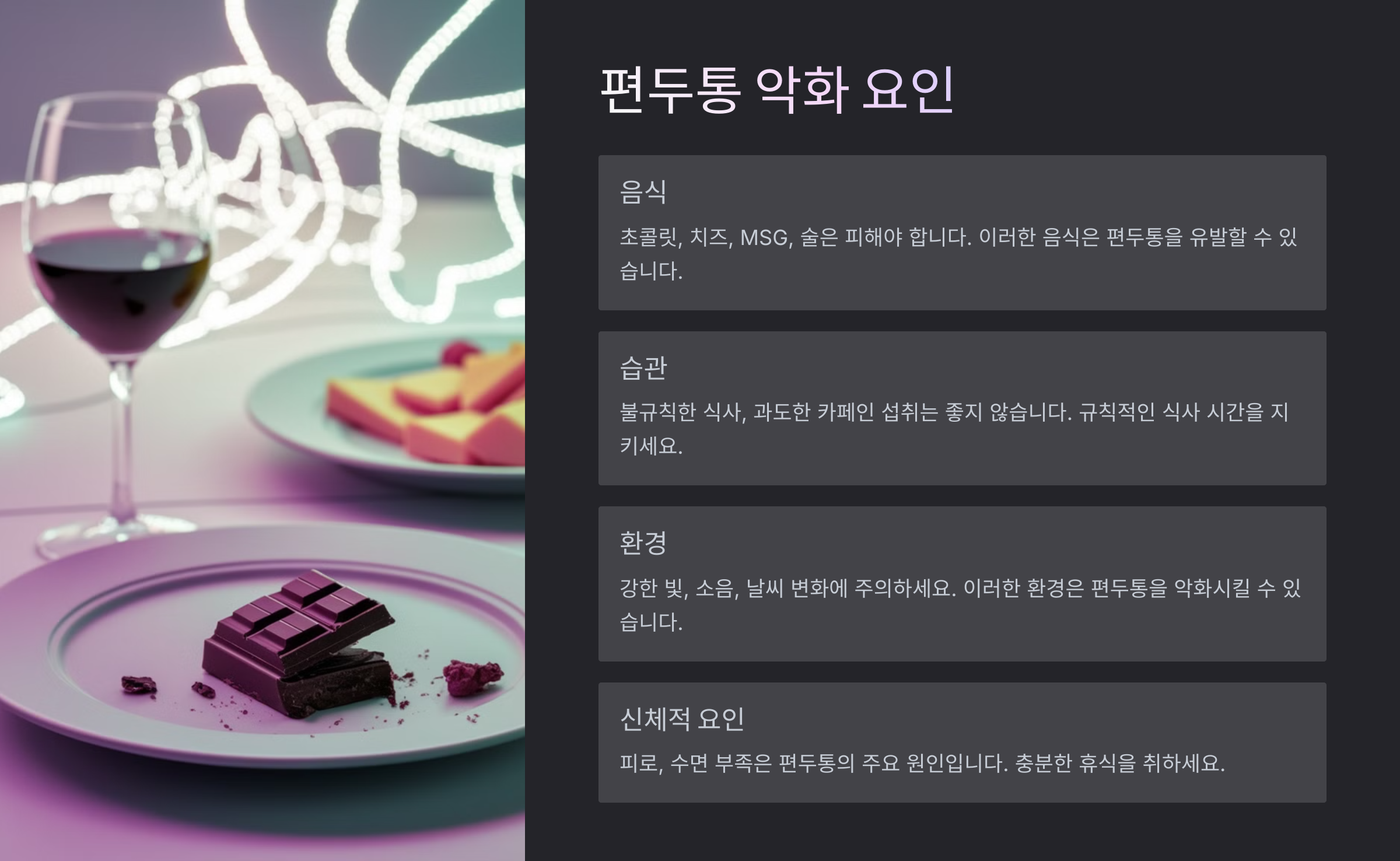 | 식습관 | 카페인, 초콜릿, 치즈, 인공조미료 등 특정 음식 |