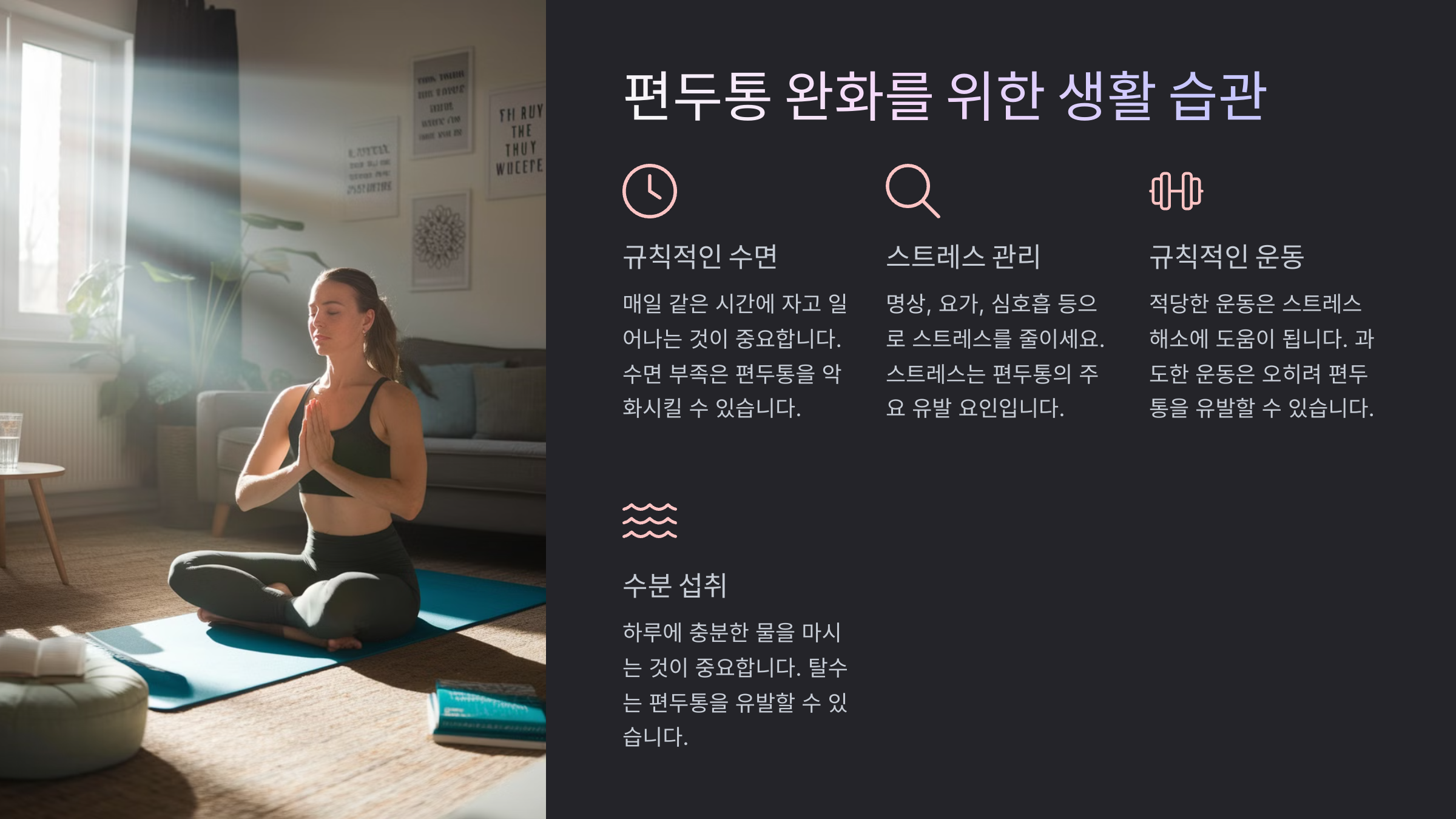 | 🚶♀️ 생활 습관 개선 | 편두통 예방 효과, 전반적인 건강 개선 | 꾸준한 실천이 필요함 |