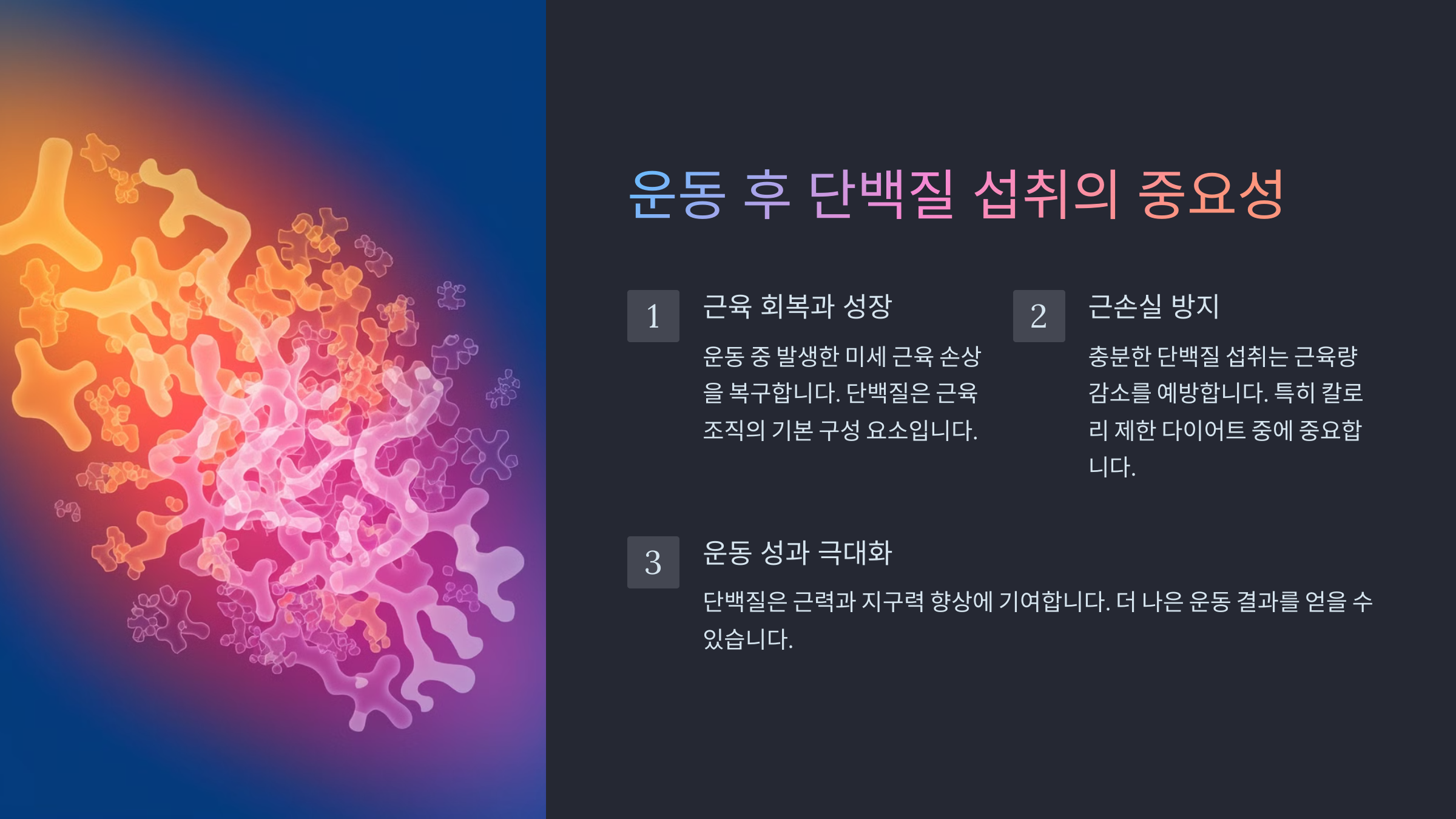 | 운동 후 단백질 섭취 | 근육 회복 속도 | 근육 성장 효과 |