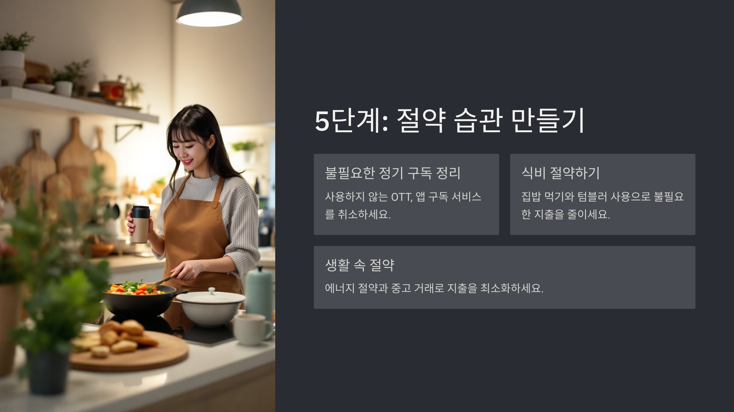 | 불필요한 구독 서비스 해지 | 매달 자동 결제되는 서비스 점검 후 필요 없는 것은 해지 |