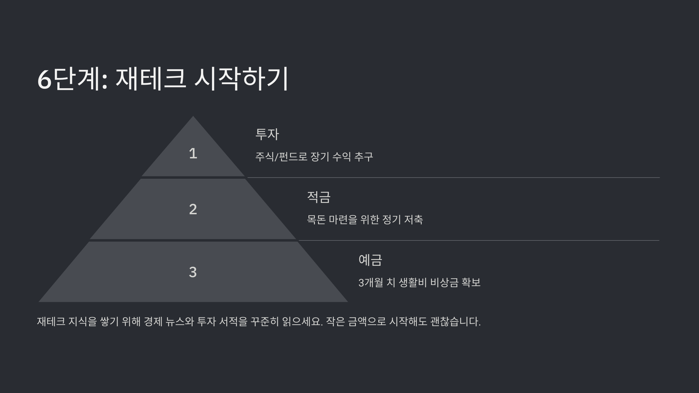 A6. 먼저 가계부를 작성하고, 불필요한 지출을 줄이는 것부터 시작해요. 그다음, 적금과 ETF 같은 안정적인 투자 상품에 소액부터 투자해 보는 것이 좋아요. 📈