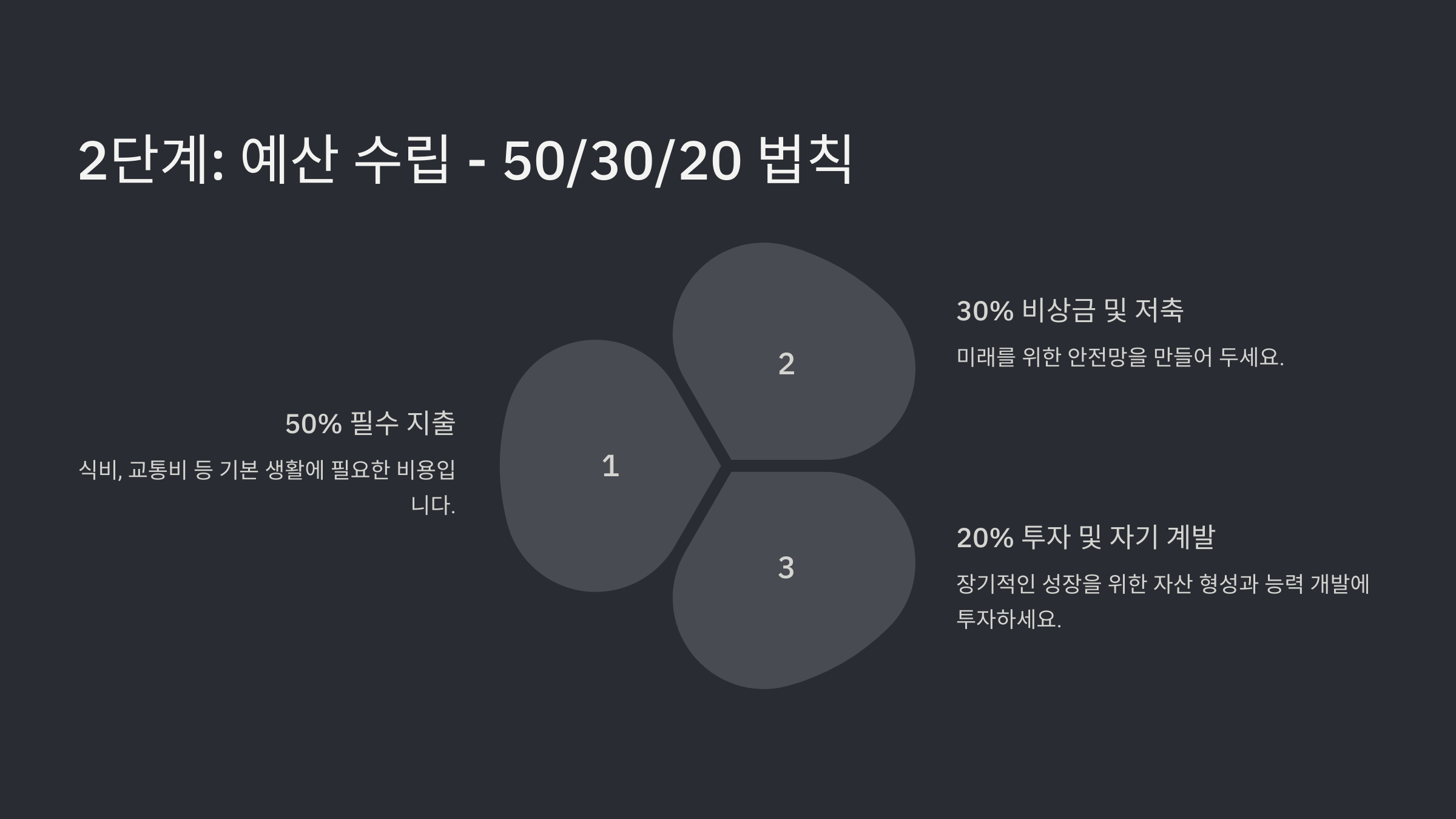 | 고정 지출 (주거비, 공과금 등) | 50% | 150만원 |