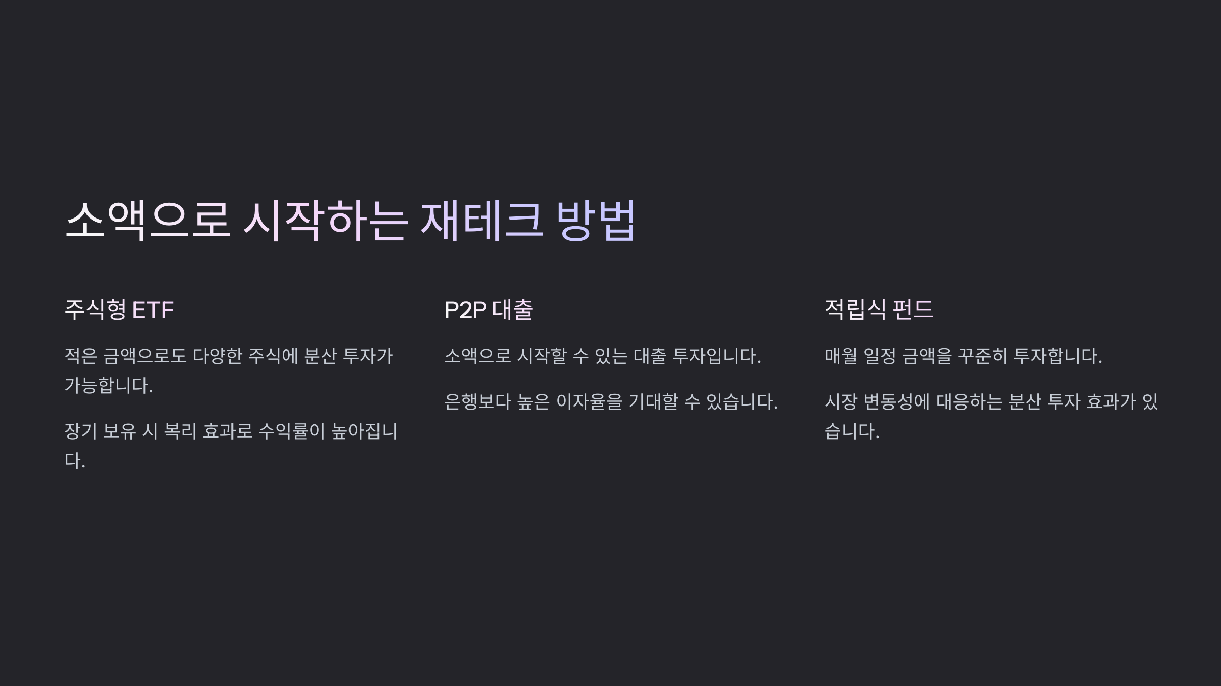 소액으로 시작할 수 있는 대표적인 재테크 방법을 살펴볼까요?