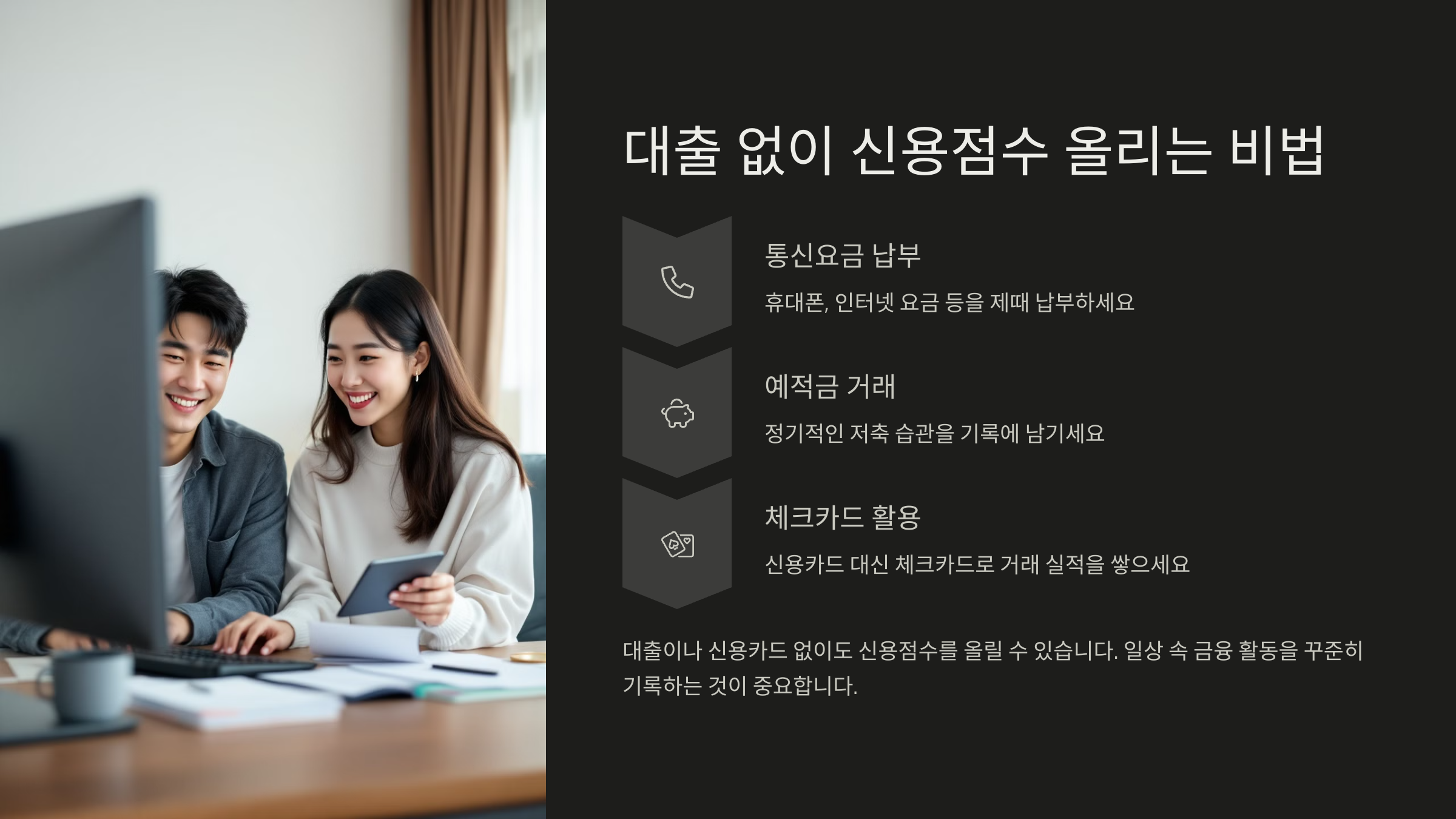 그럼 대출 없이 신용점수를 올릴 수 있는 방법도 있을까요? 당연하죠! 다음에서 알아볼게요. 🔥