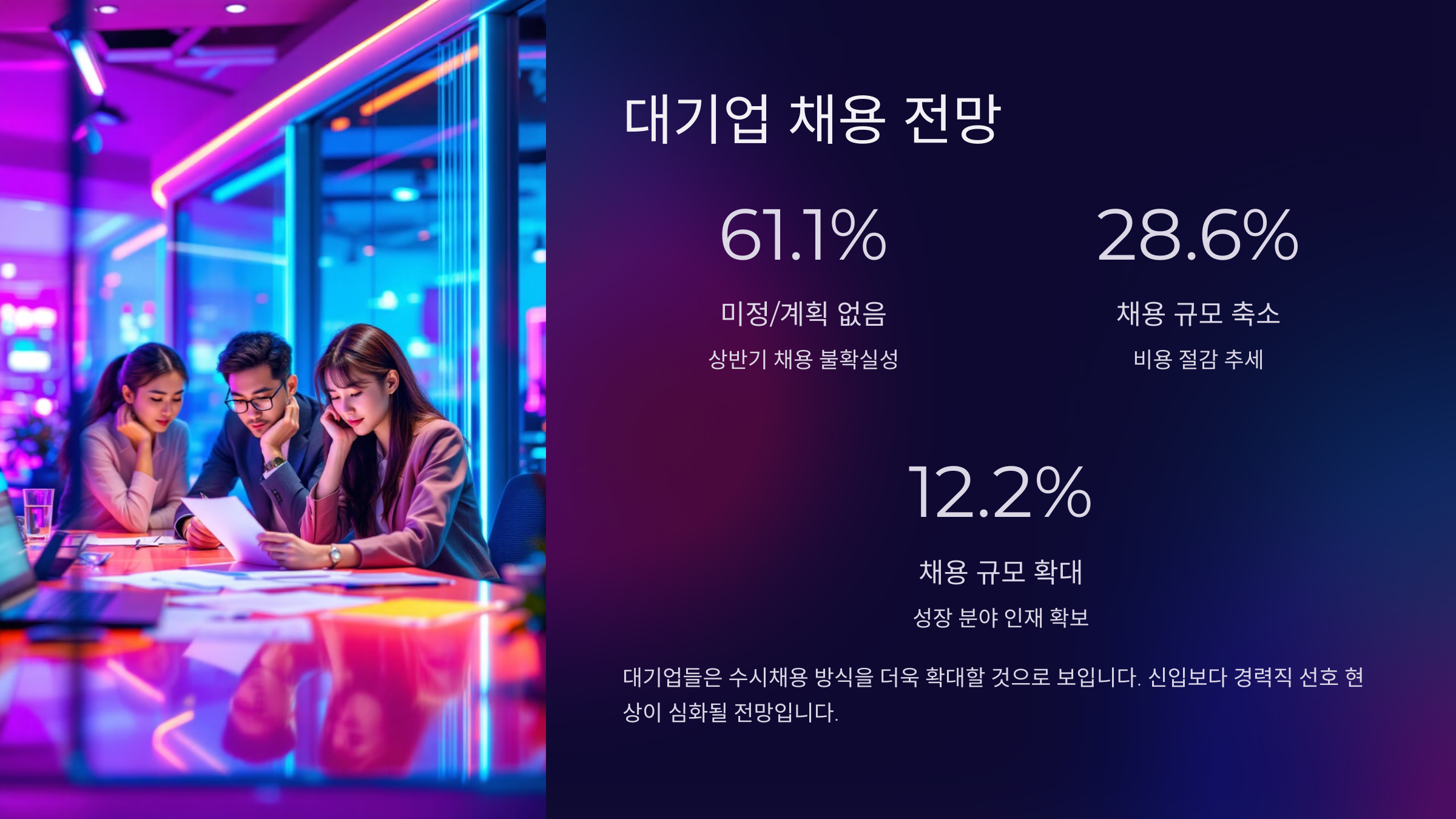 하지만 대기업들이 정규직보다는 계약직이나 인턴십을 활용해 유연한 인력 운영을 하려는 경향이 높아질 수 있어요. 따라서 대기업 취업을 준비하는 분들은 '정규직 채용'만을 목표로 하기보다는, 인턴십·계약직 등 다양한 방식으로 경력을 쌓는 것이 중요해요! 💼