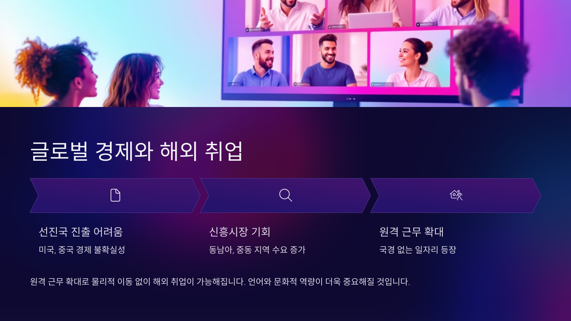 특히 대기업 채용 규모가 늘어날지, 스타트업과 벤처기업이 새로운 기회를 제공할지, 프리랜서와 1인 기업이 현실적인 대안이 될 수 있을지 등이 주요 관심사예요. 글로벌 경제 위기 속에서 해외 취업의 가능성도 중요한 이슈로 떠오르고 있어요. 🌍