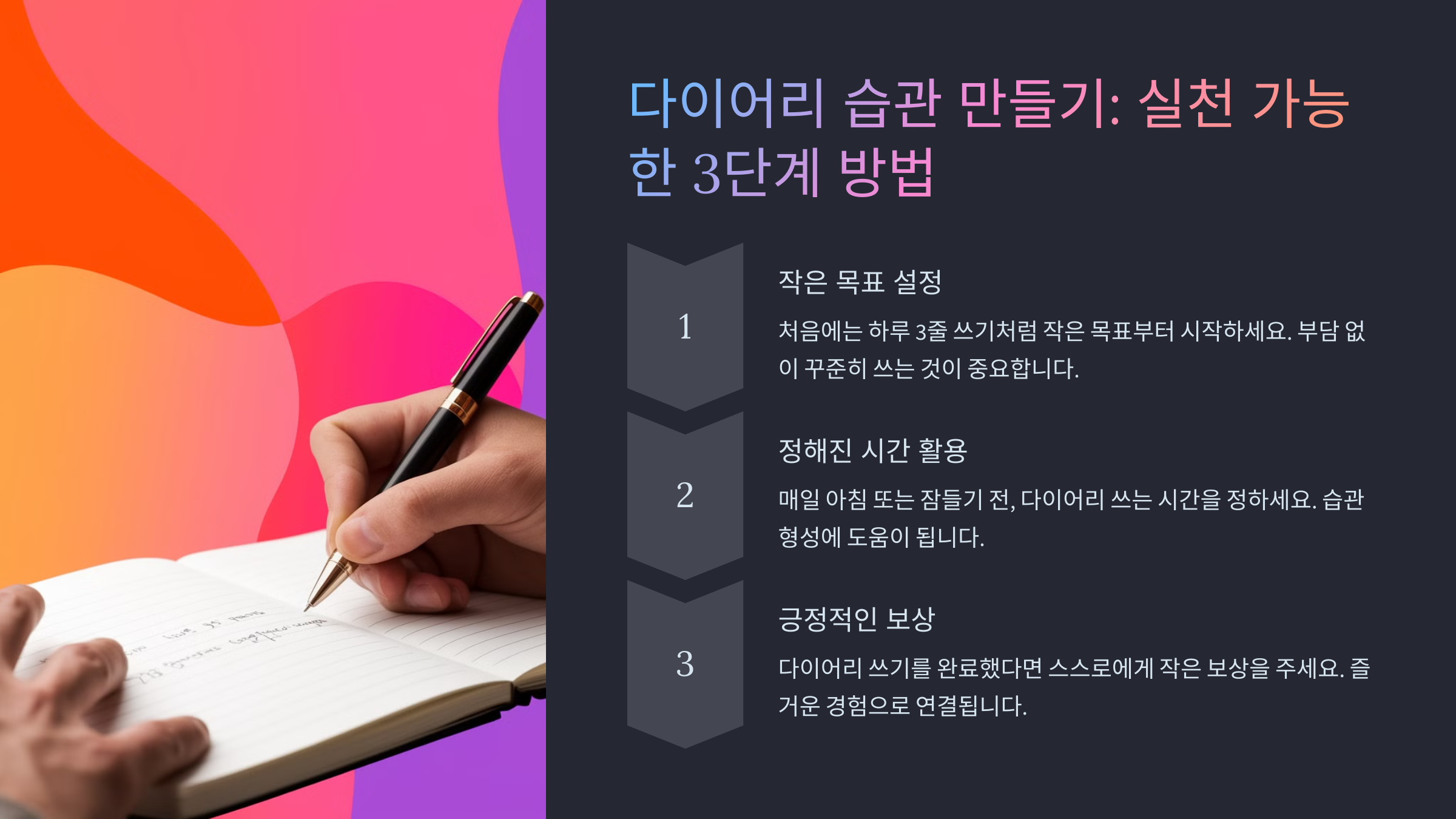다이어리 쓰기는 단순한 기록이 아니라, 나 자신을 돌아보고 성장하는 중요한 과정이에요. 하루 10분만 투자하면 습관이 되고, 점점 더 자연스럽게 다이어리를 활용하게 될 거예요! 😊