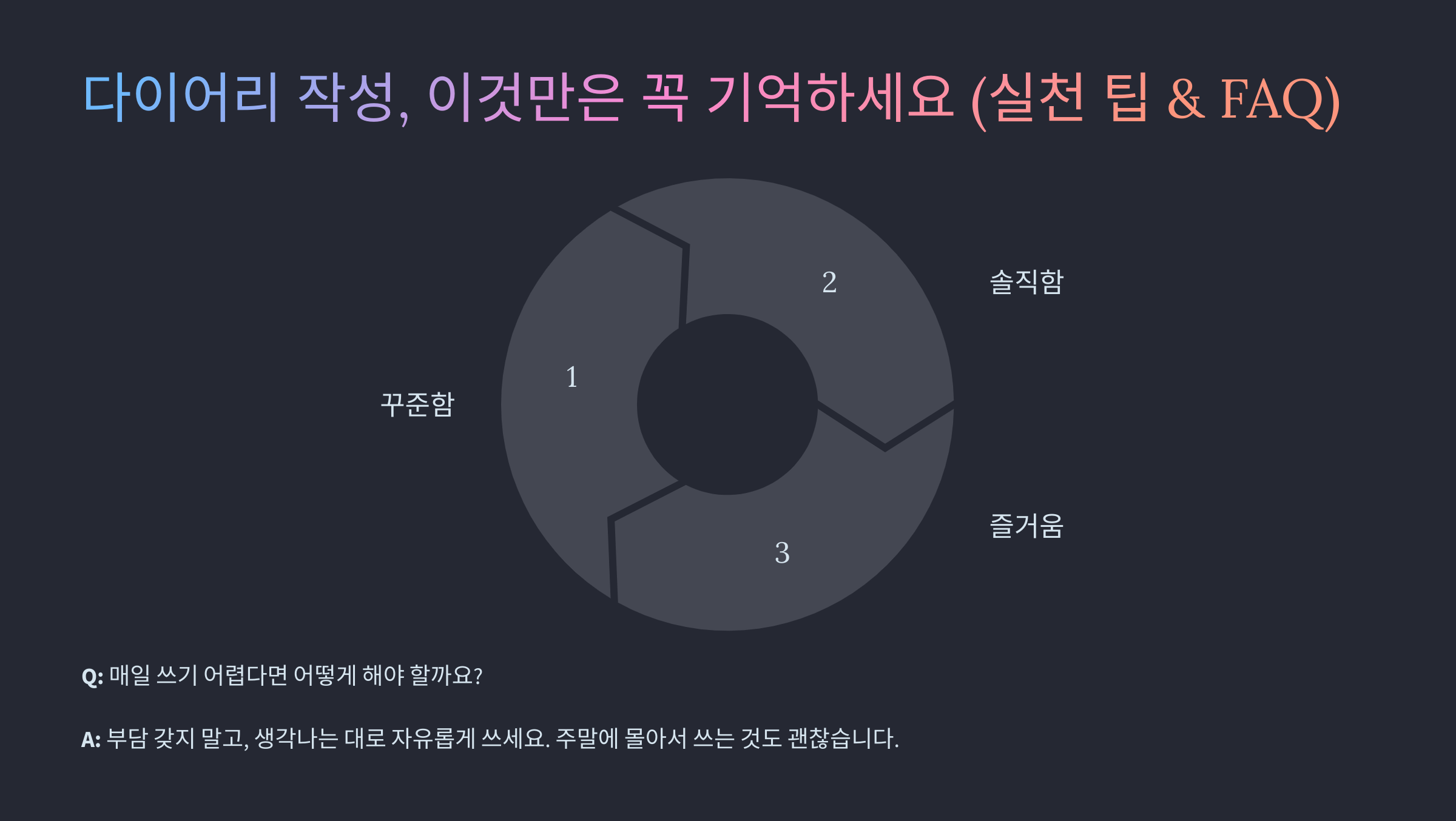 A4. 처음부터 완벽하게 쓰려고 하지 말고, 짧고 간단하게 기록하는 것이 중요해요. 하루 3줄 일기처럼 핵심적인 내용만 적어도 충분해요.