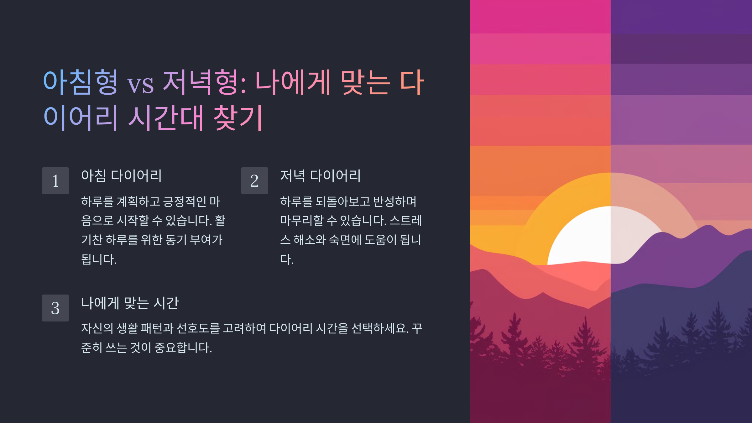 아침과 저녁 다이어리는 각자의 역할이 있어요. 둘 다 활용하면 더욱 효과적이지만, 본인의 성향에 맞게 선택하는 것도 좋아요! ☀️🌙