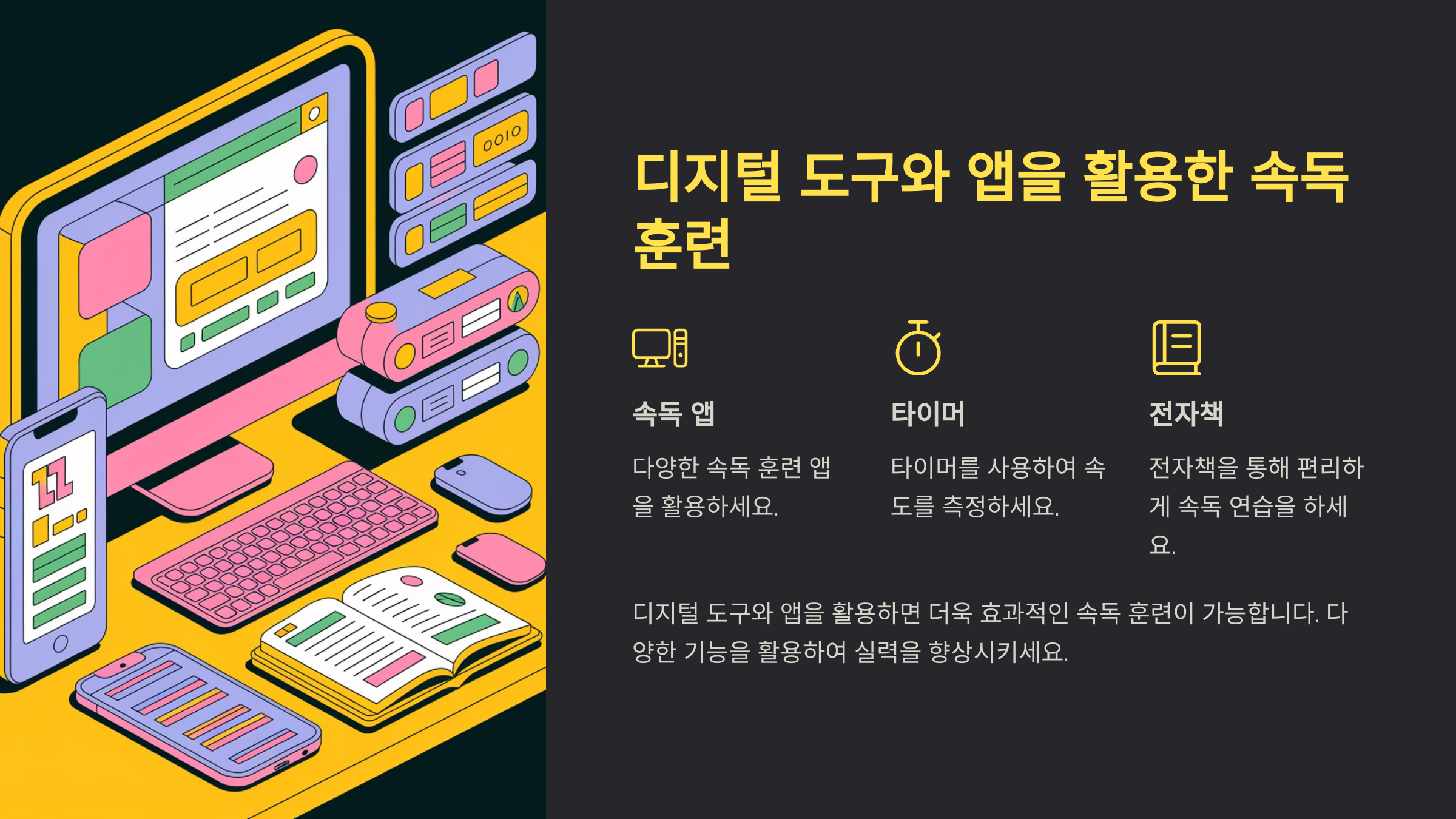 속독을 훈련할 때, **적절한 도구**를 활용하면 더욱 효과적이에요! 📲 요즘은 다양한 앱과 웹사이트가 있어서 혼자서도 체계적으로 연습할 수 있답니다.