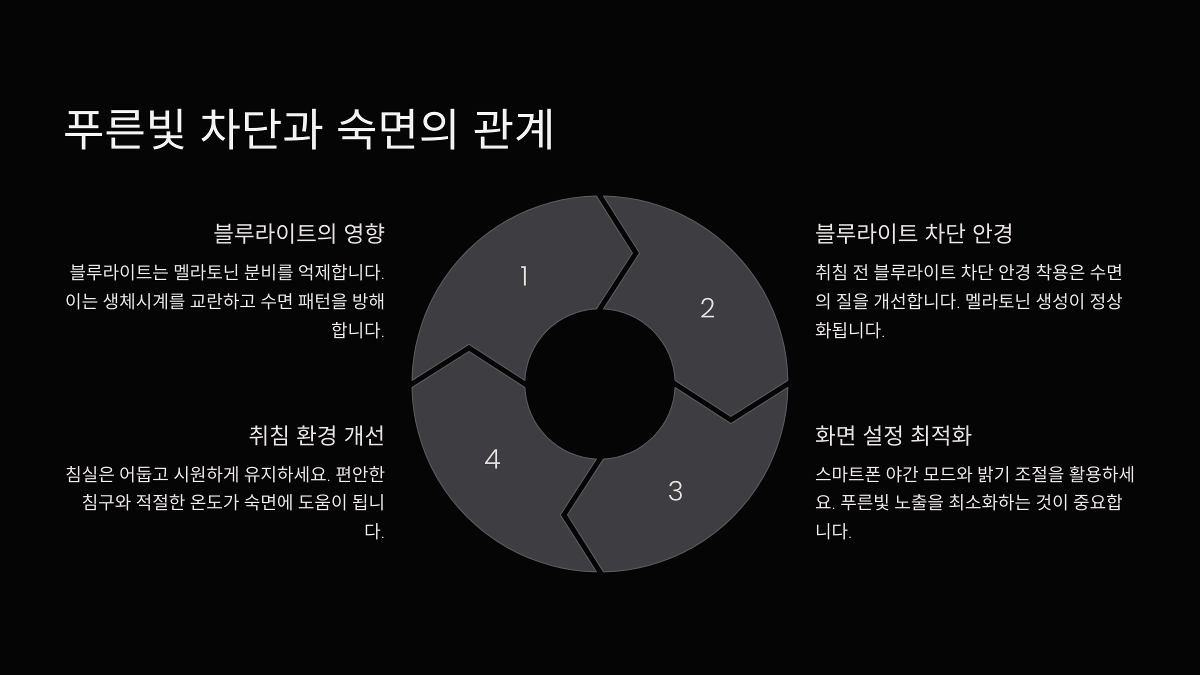 지금까지 디지털 미니멀리즘을 실천하는 방법을 알아봤어요. 다음으로는 ‘푸른빛 차단과 숙면의 관계’에 대해 이야기해 볼게요! 🌙