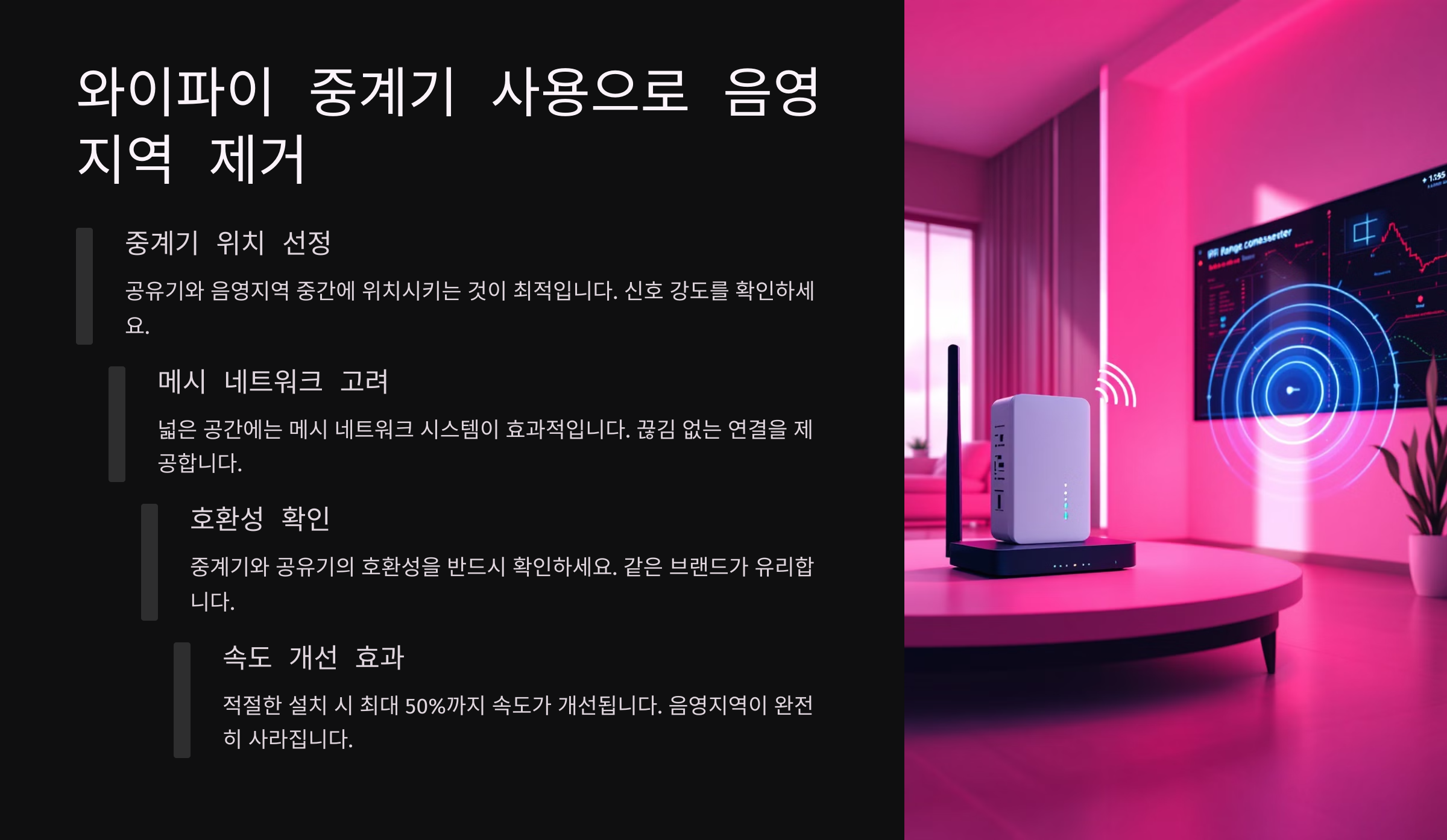 중계기를 적절한 위치에 배치하면 신호를 확장할 수 있어요. 공유기와 음영지역 사이의 중간 지점이 가장 이상적인 위치랍니다!