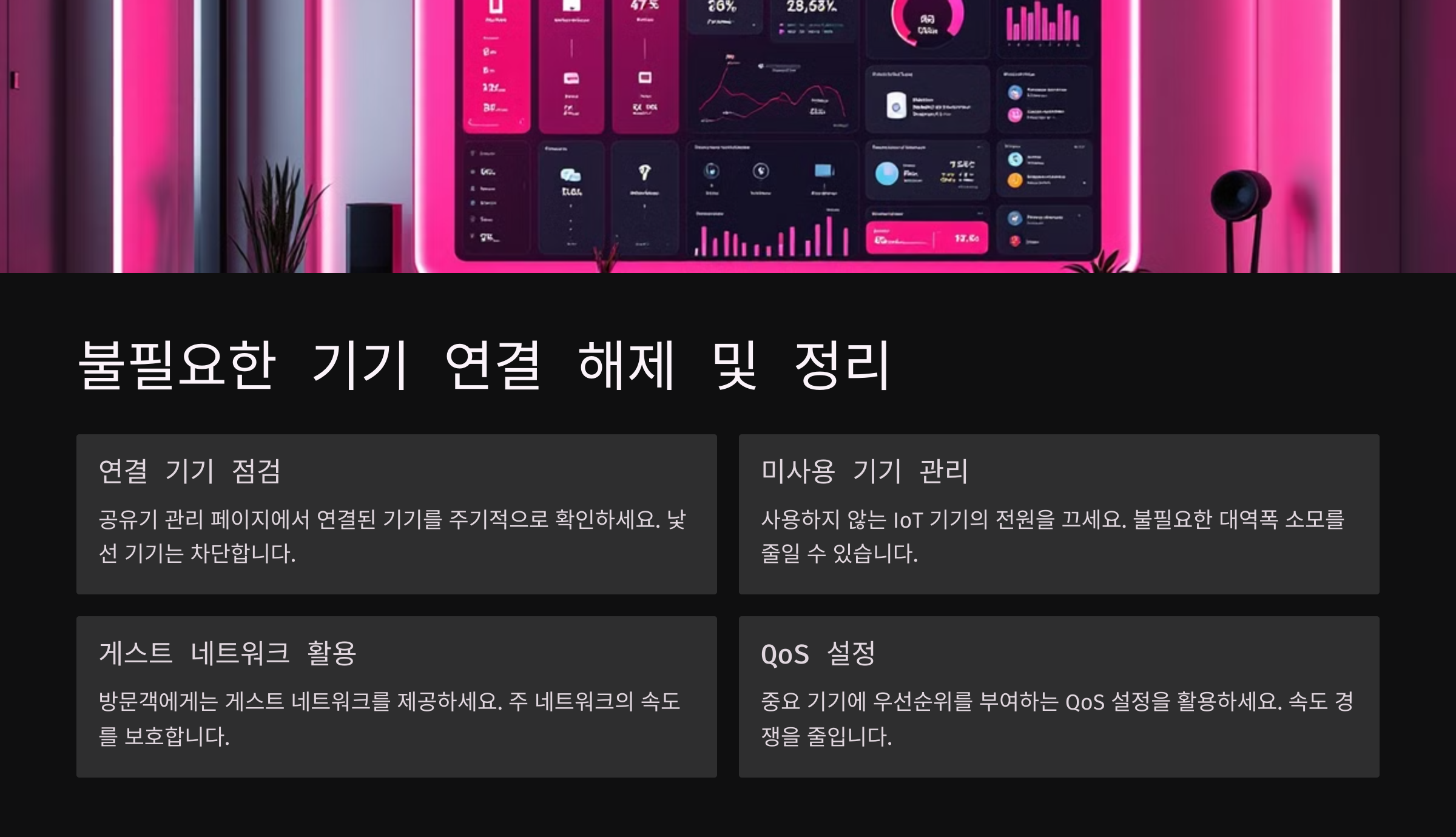 사용하지 않는 기기들은 와이파이 연결을 해제하거나 유선 LAN을 사용하는 것이 좋아요. 그리고 IoT 기기(스마트 전구, CCTV, 음성 비서 등)는 2.4GHz 대역에, 스마트폰과 노트북 같은 기기는 5GHz 대역에 연결하는 것이 효과적이에요. 📡