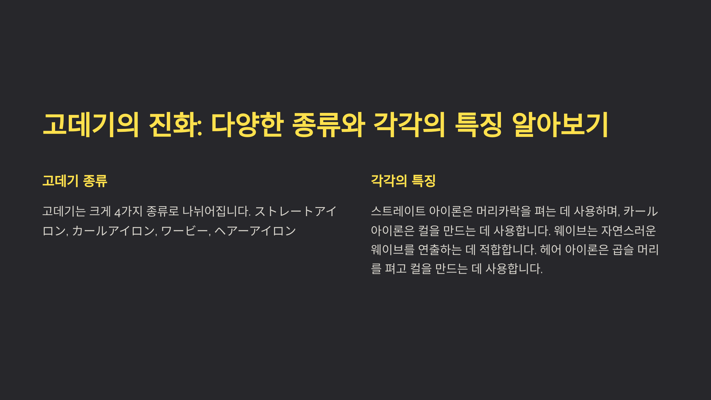고데기는 크게 판 고데기, 봉 고데기, 자동 고데기로 나뉘어요. 각각의 특징을 알면 원하는 스타일에 맞게 선택할 수 있답니다. 😊