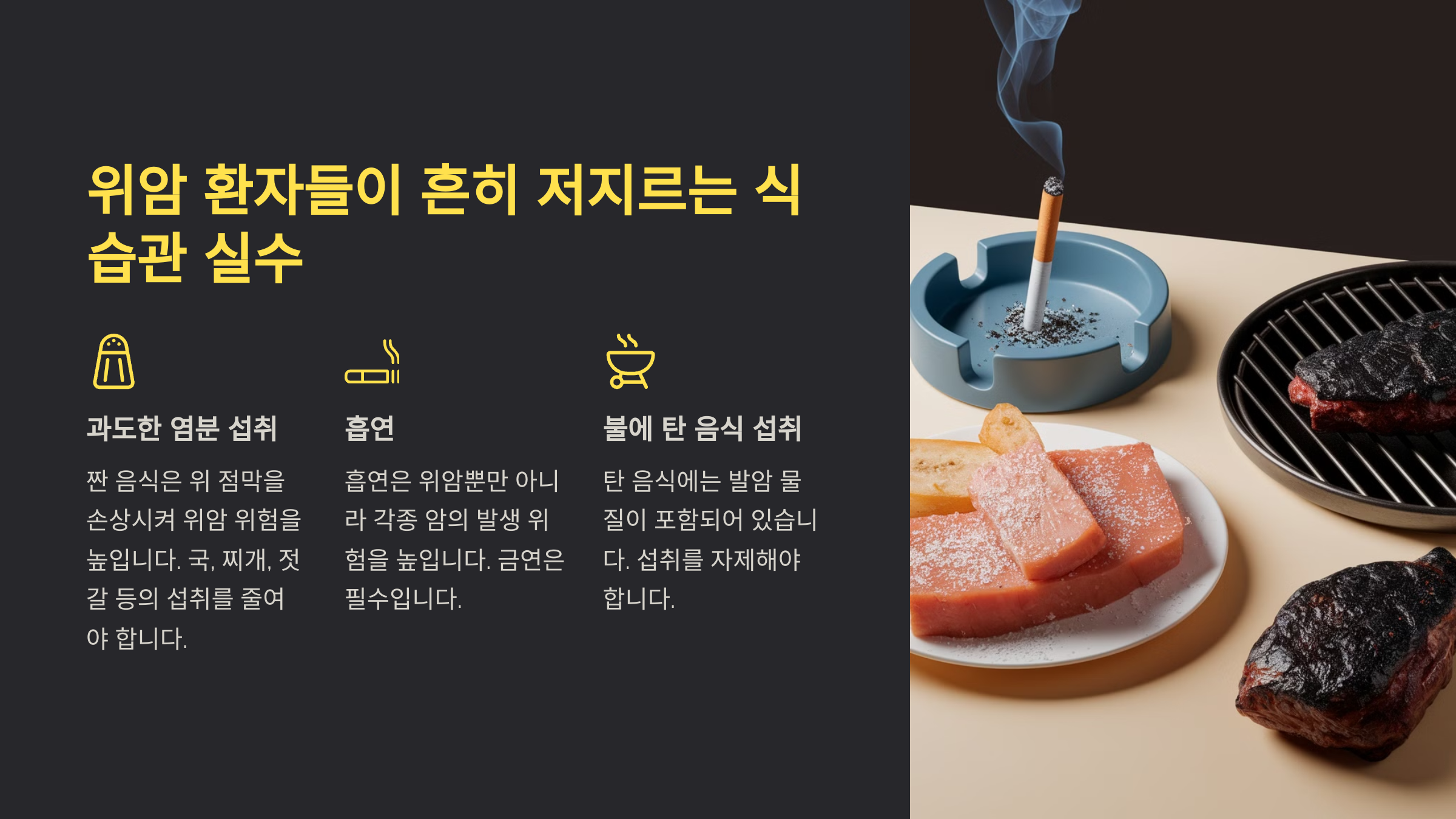 위암 환자들은 치료 후에도 올바른 식습관을 유지하는 것이 매우 중요해요. 하지만 잘못된 식습관을 유지하면 위 건강이 악화될 수 있어요.