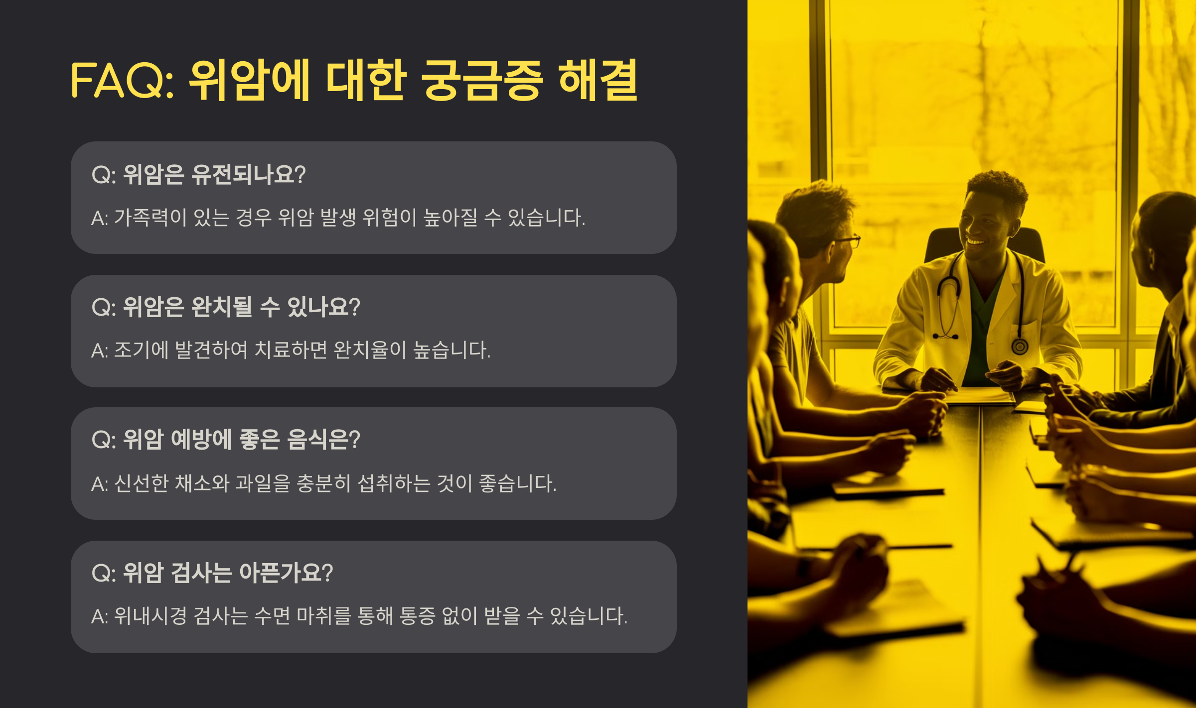 A2. 위암 자체가 유전되는 것은 아니지만, 가족 중 위암 환자가 있다면 위험도가 높아질 수 있어요. 정기 검진이 중요해요.