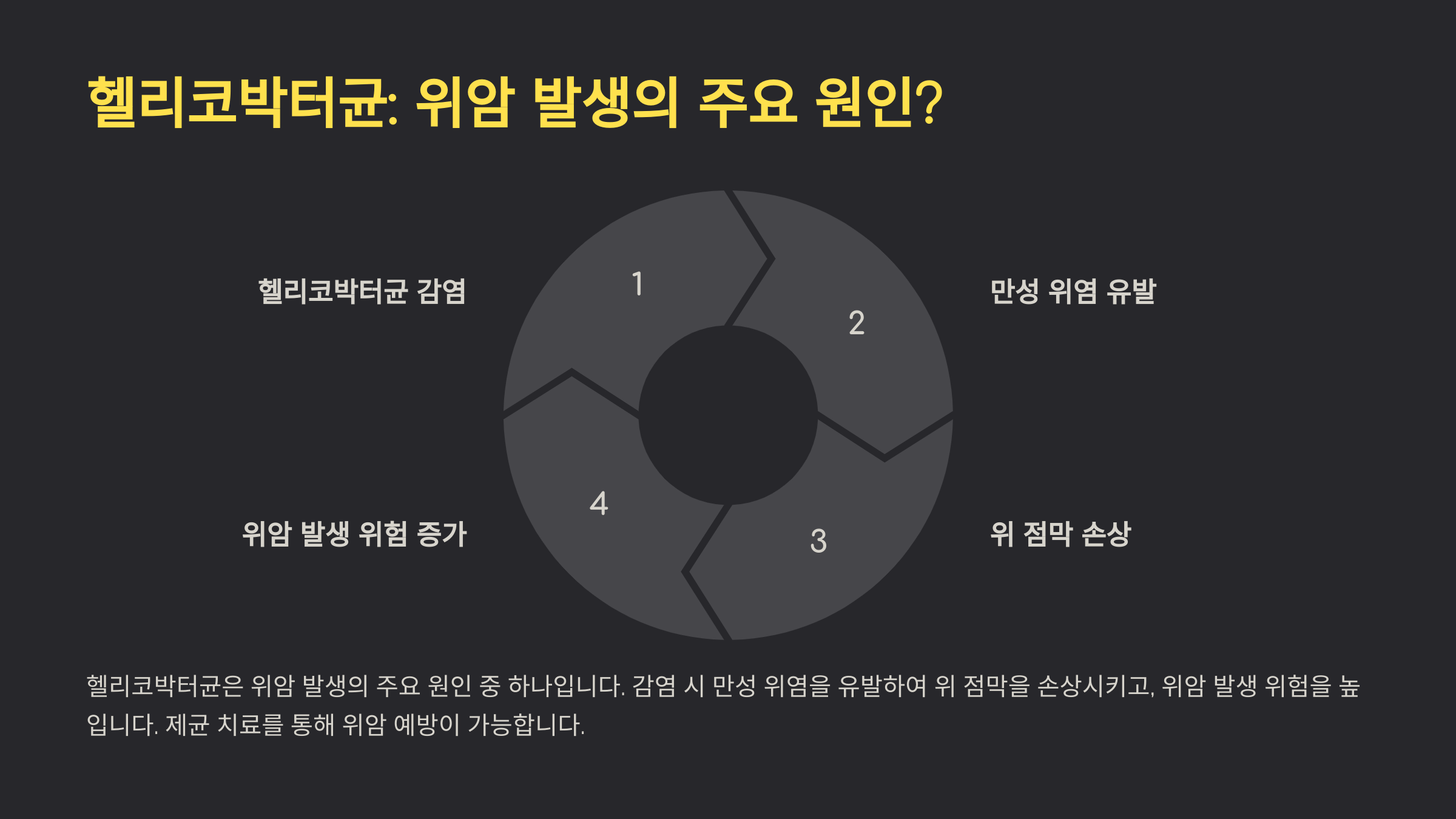 헬리코박터 파일로리균은 위 점막에 서식하는 세균으로, 위염과 위궤양뿐만 아니라 위암과도 밀접한 관련이 있어요. 이 균이 위 점막을 지속적으로 자극하면 세포 변형이 일어나 암으로 발전할 가능성이 높아진답니다.
