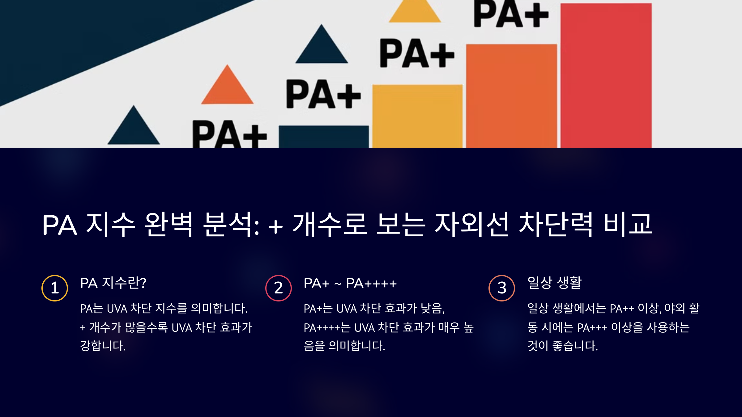 SPF가 UVB 차단력을 의미한다면, PA 지수는 UVA 차단력을 나타내요. UVA는 피부 깊숙이 침투해 주름과 기미의 원인이 되므로, PA 수치도 꼭 확인해야 해요. 🌞
