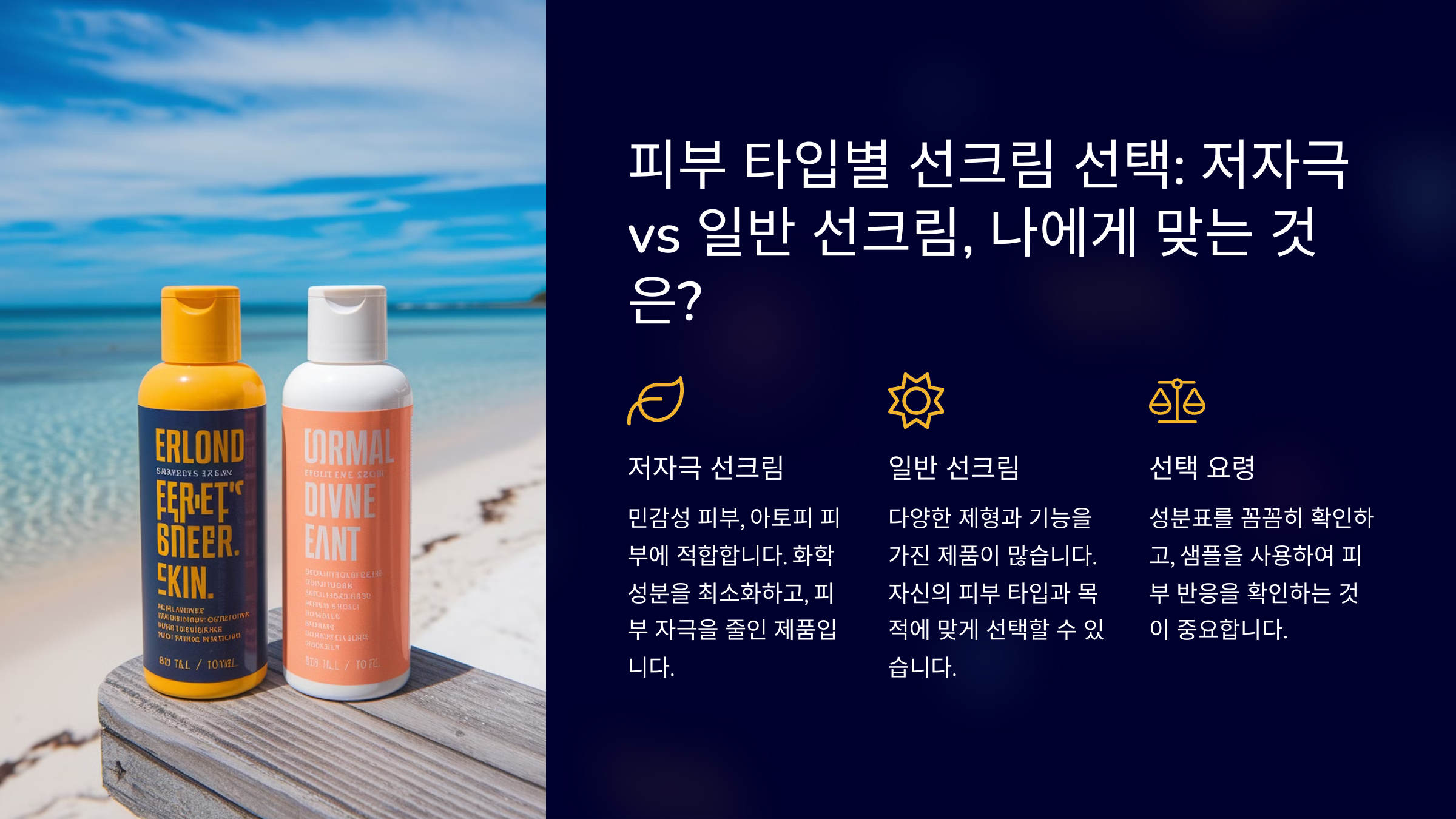 피부가 민감하다면 저자극 선크림을 선택하고, 가벼운 발림성을 원한다면 일반 선크림이 좋아요. 자신의 피부 타입에 맞는 제품을 선택하세요! 😊