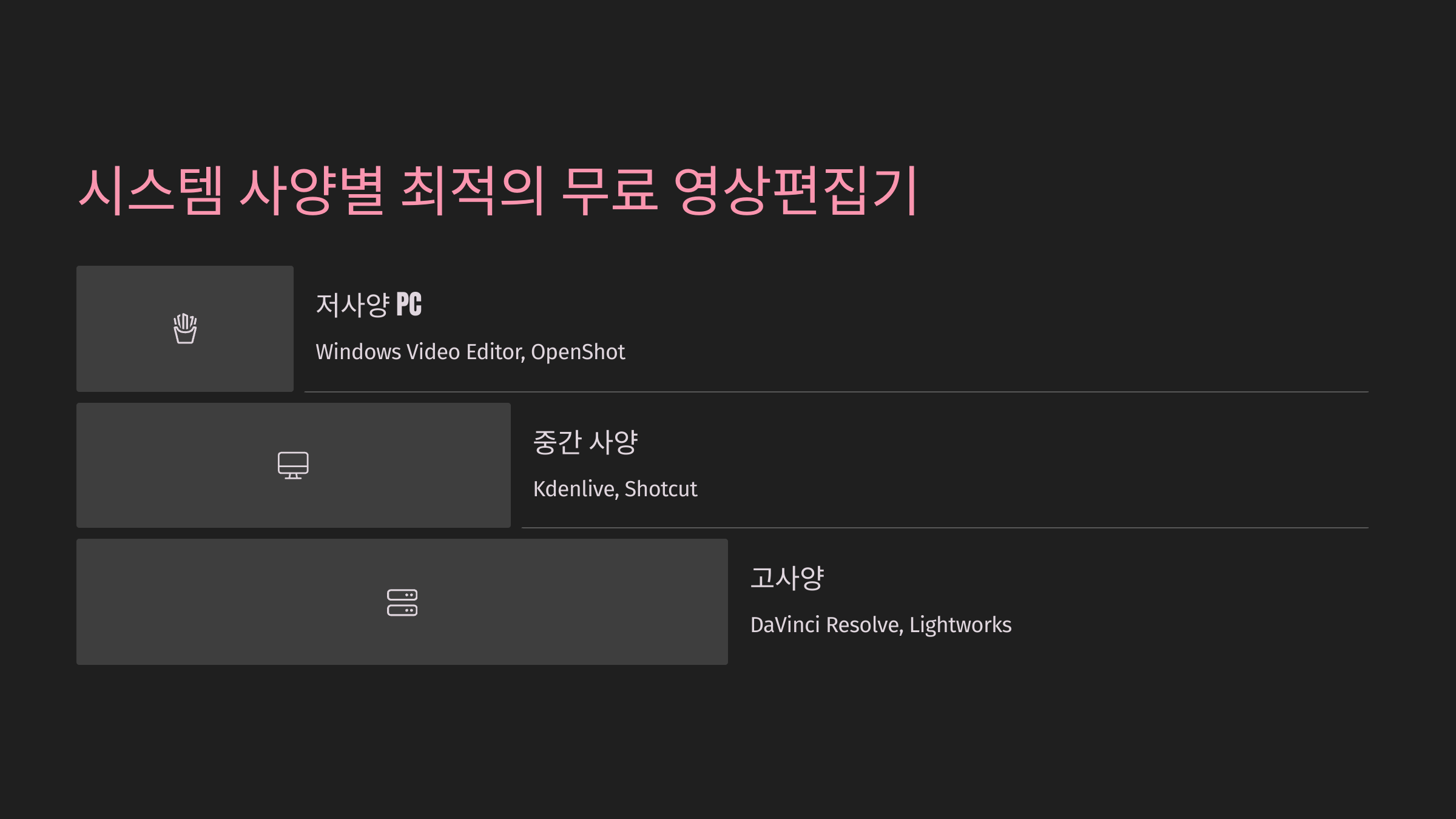 다음은 시스템 사양별로 최적화된 무료 영상 편집기를 알아볼게요! 🖥️