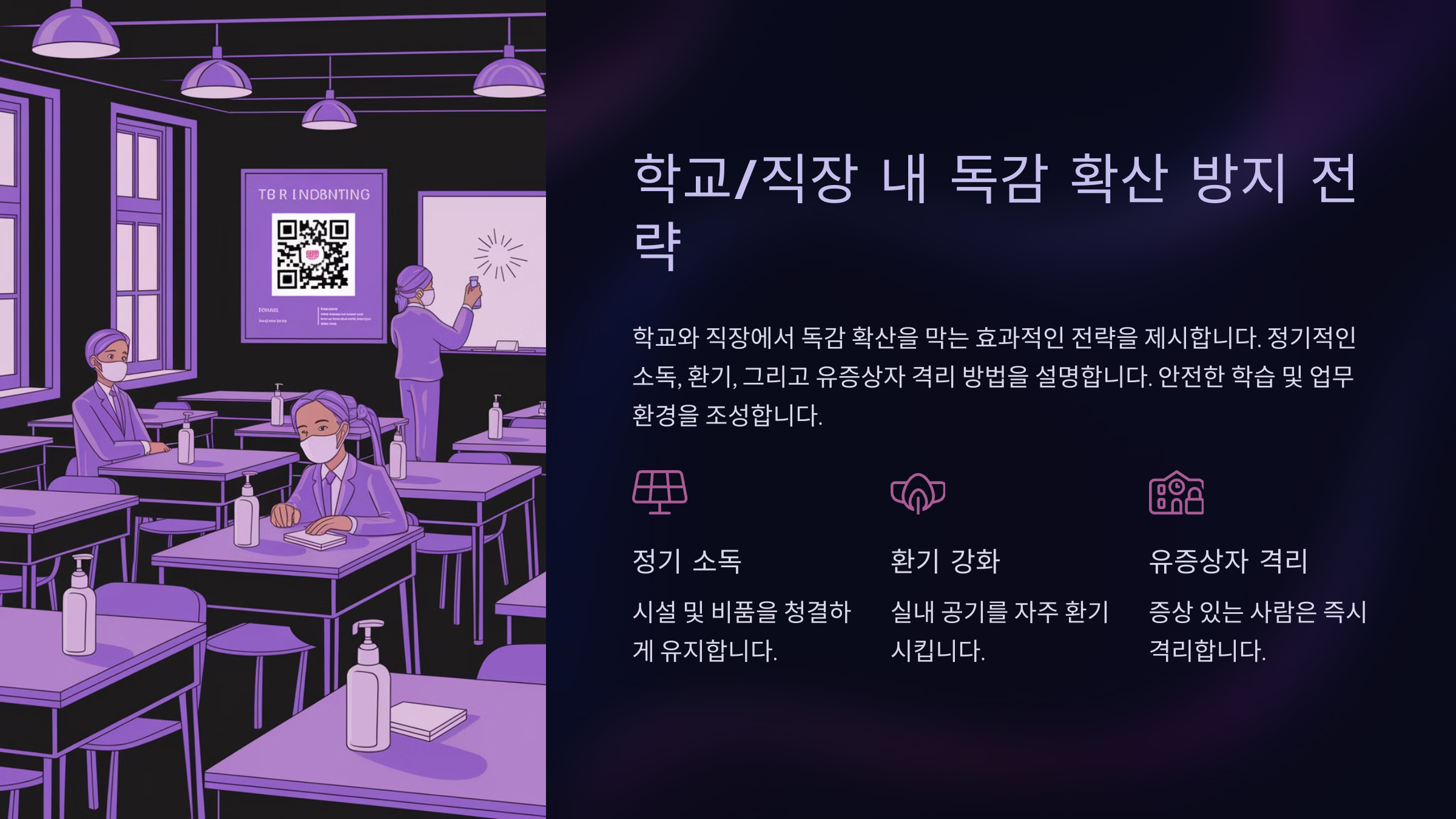 학교에서는 매일 교실을 환기하고, 책상과 문 손잡이 같은 공동 사용 공간을 소독해야 해요. 학생들은 손 씻기와 기침 예절을 철저히 지켜야 하고, 발열 증상이 있으면 등교를 피하는 것이 좋아요. 교사들도 학생들의 건강 상태를 수시로 확인하고, 독감 증상이 있는 경우 즉시 보호자에게 연락해야 해요. 📚