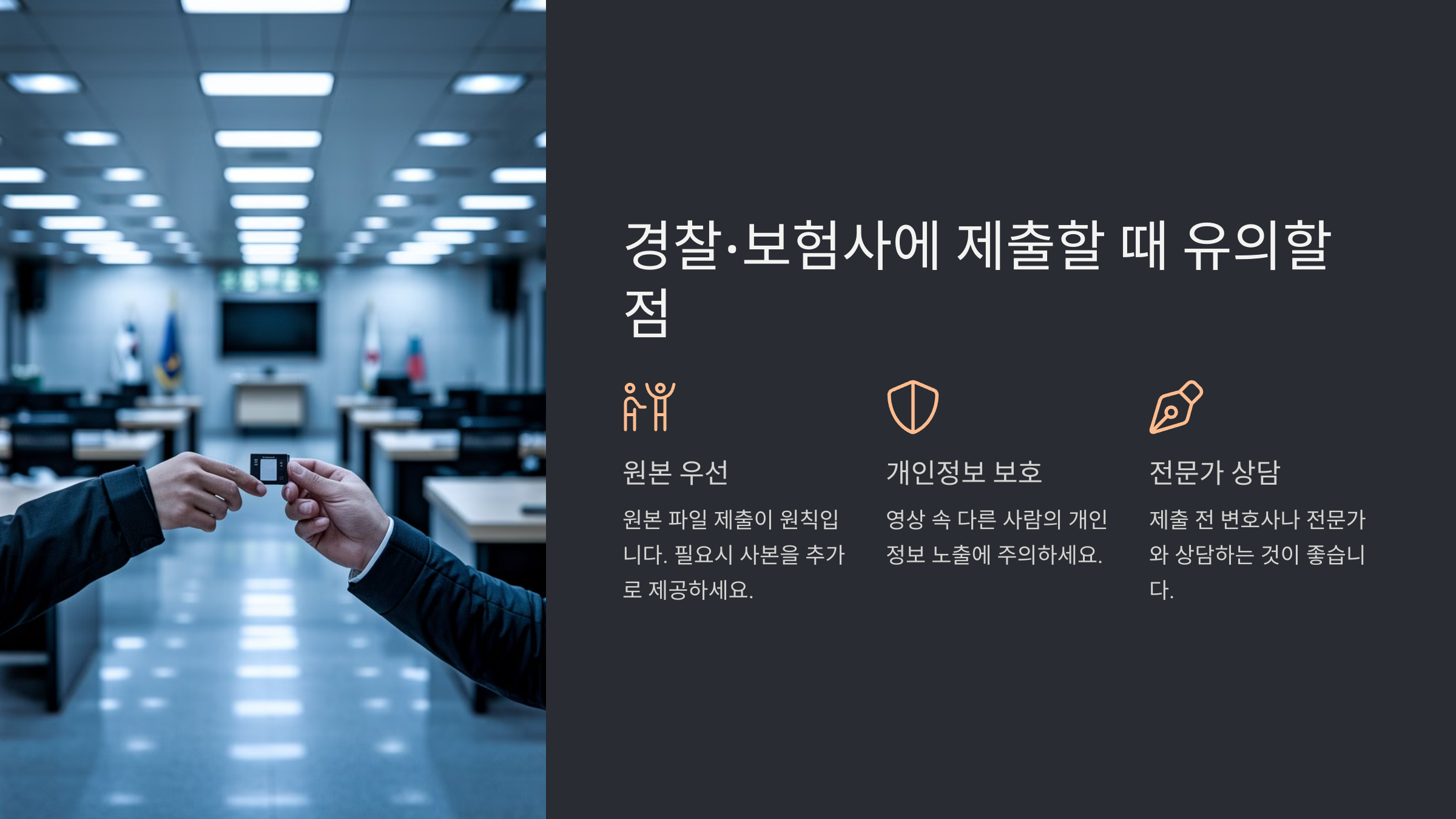 먼저, 경찰이나 보험사에 제출할 때는 반드시 원본 영상을 제출해야 해요. 일부만 편집하거나 화질을 조정하면 증거 조작으로 의심받을 수 있어요. 🚫