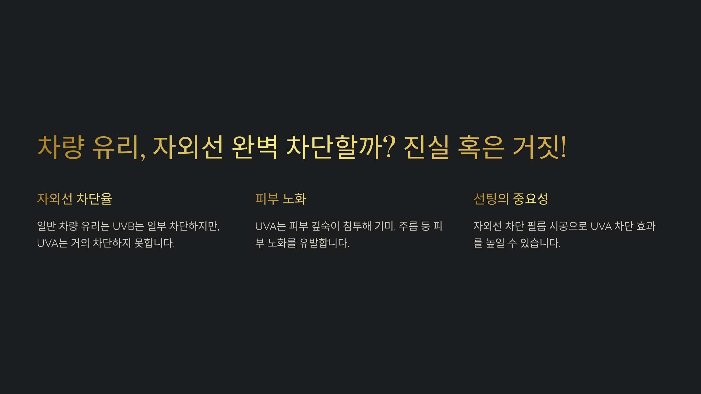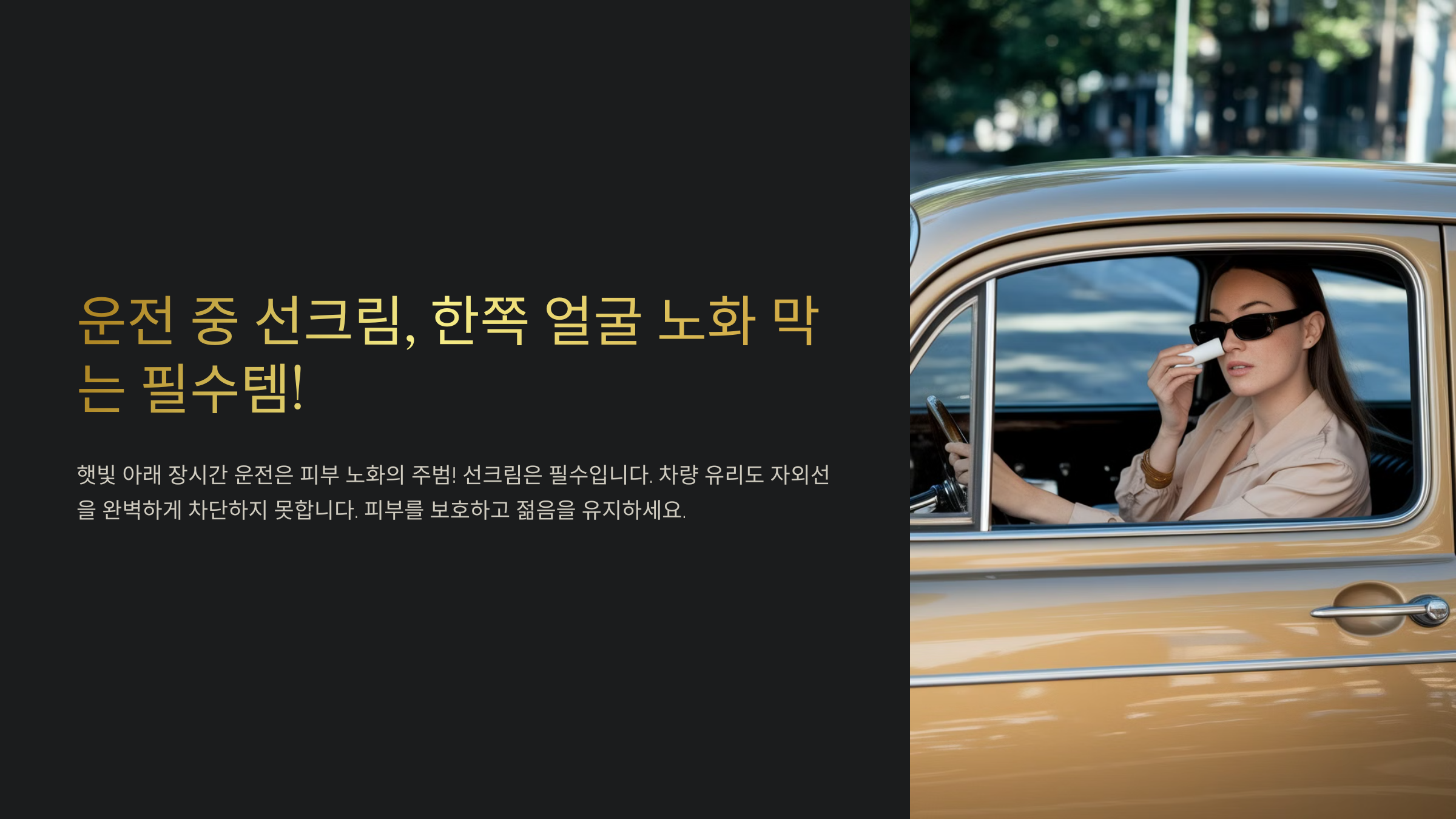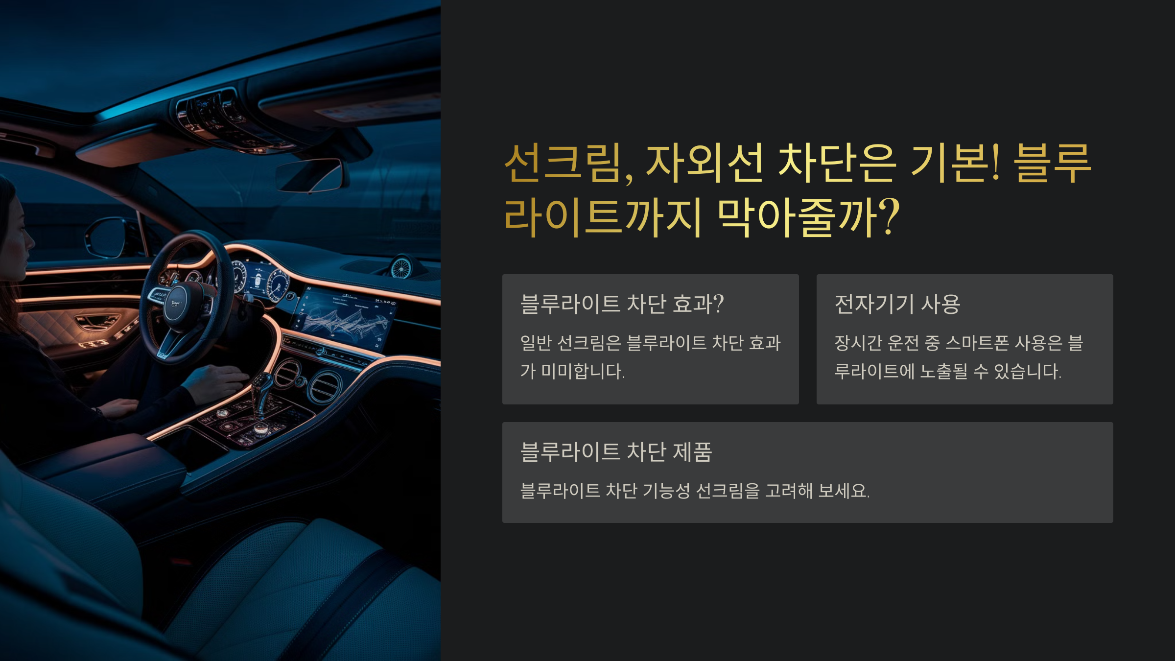 이 문제를 해결하려면 **차량용 선팅 필름을 활용하거나, 반드시 선크림을 바르는 습관**을 가져야 해요. 선팅 필름이 있어도 100% 차단되지 않으므로, **선크림은 필수**랍니다! 😊