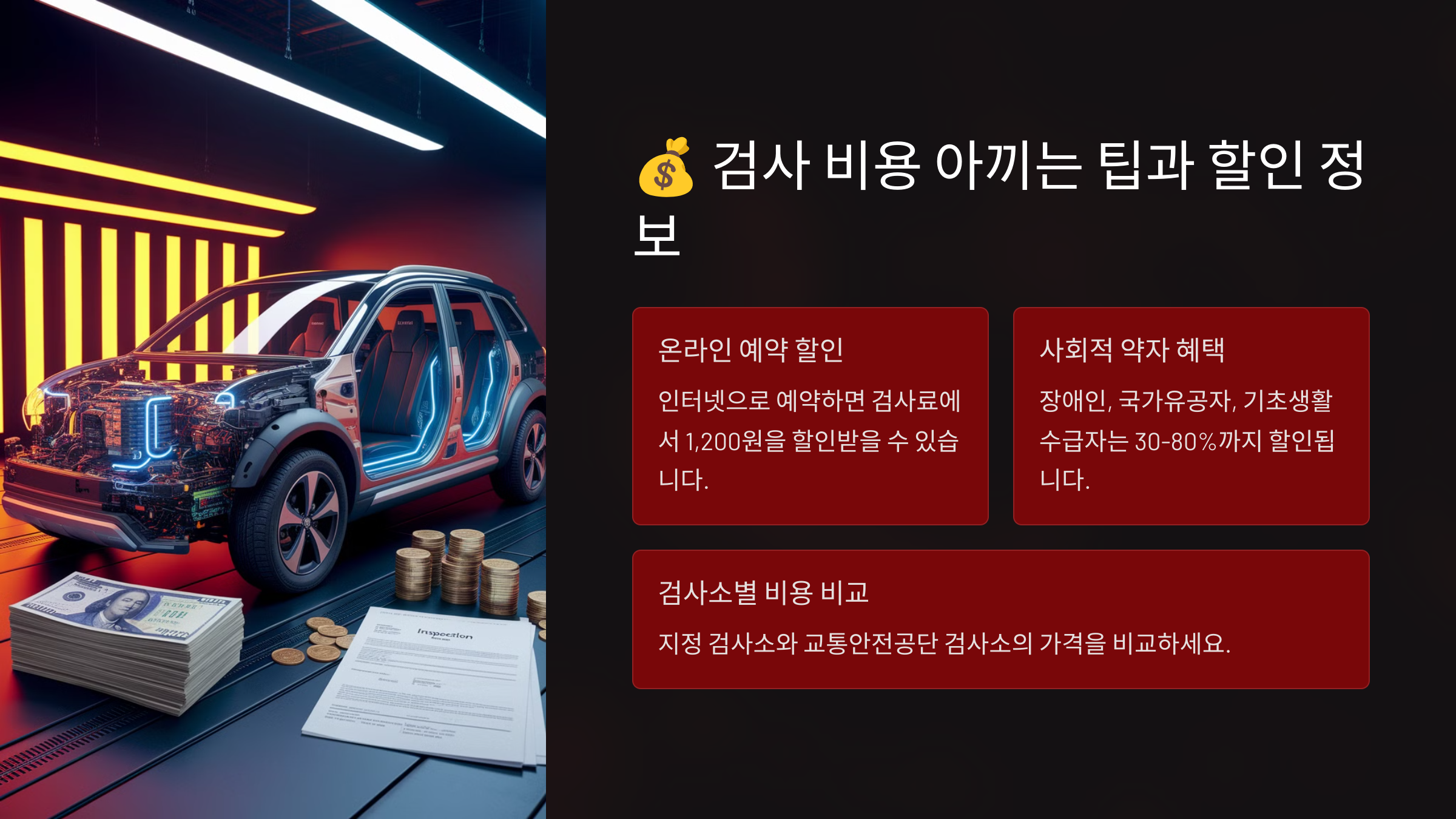 자동차 검사 비용도 부담될 수 있어요. 하지만 할인 방법을 잘 알면 알뜰하게 검사받을 수 있답니다! 🤑