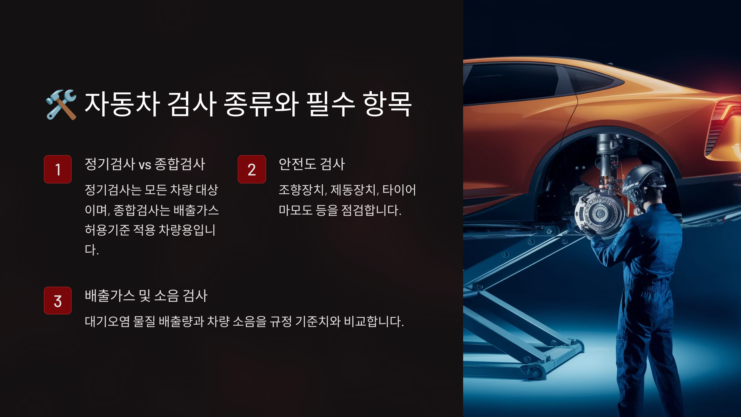 자동차 검사는 크게 두 가지로 나뉘어요. '정기 검사'와 '종합 검사'가 있어요. 어떤 검사든 미리 준비하면 시간과 비용을 절약할 수 있답니다! 📌