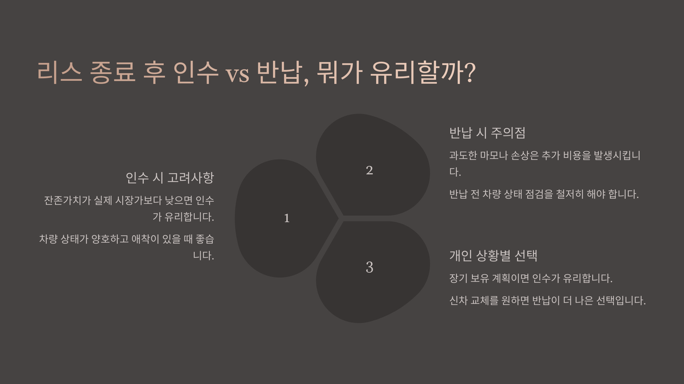 이처럼 중고차 리스에는 장점뿐만 아니라, 신중하게 고려해야 할 단점도 많아요. 그렇다면 리스 계약이 끝났을 때, 차량을 인수하는 게 유리할까요? 반납하는 게 나을까요? 🤔