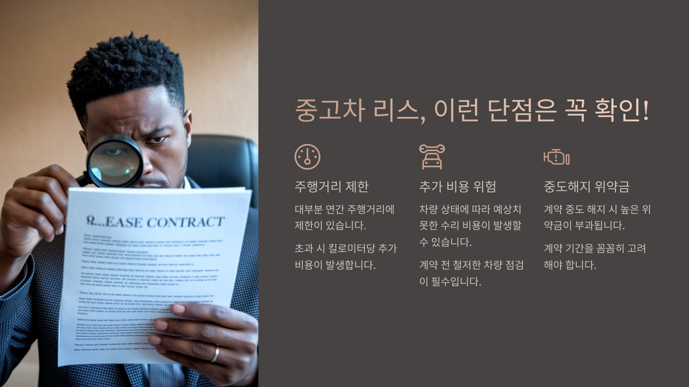 이제, 장점만 알고 중고차 리스를 선택하면 안 되는 이유도 살펴볼까요? 😲