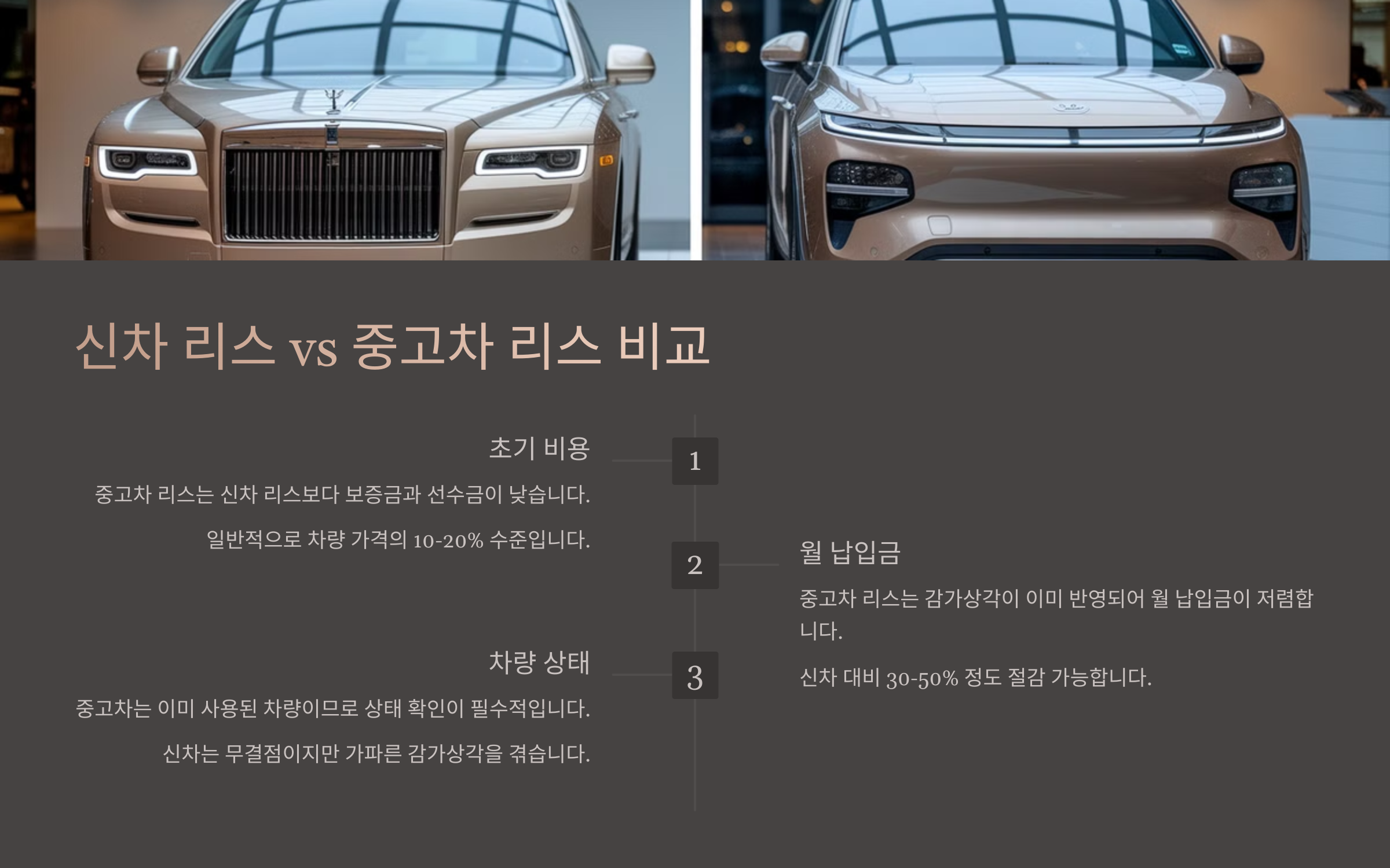 신차 리스는 완전히 새로운 차를 이용할 수 있다는 장점이 있지만, 초기 비용과 월 리스료가 높은 편이에요. 반면, 중고차 리스는 저렴한 비용으로 차량을 이용할 수 있지만, 차량 상태에 따라 리스크가 있을 수 있죠.
