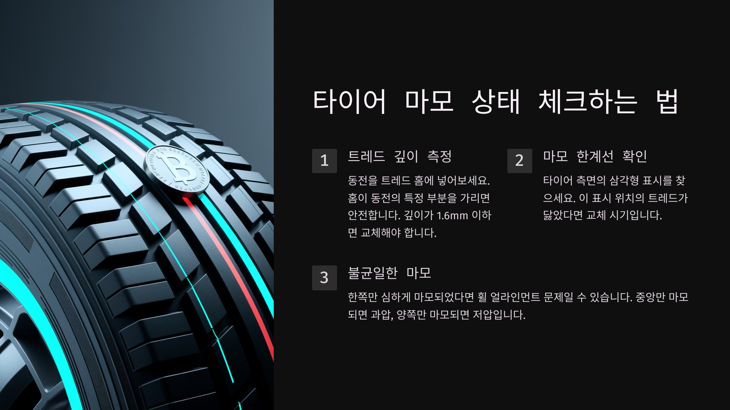 🚦 타이어 마모가 심하면 접지력이 떨어지고 제동거리가 길어져요. 마모 상태를 체크하는 쉬운 방법을 알아볼까요?