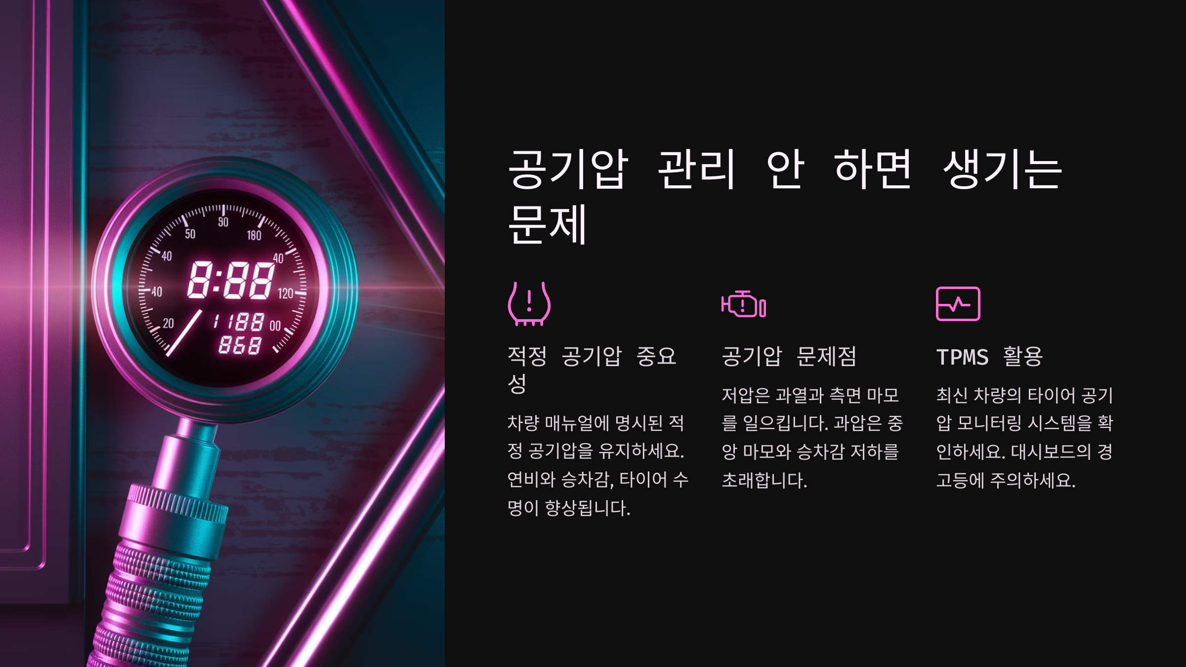 🚨 타이어 공기압이 너무 낮거나 높으면 차량 성능이 떨어지고 사고 위험이 커져요. 공기압 관리가 중요한 이유를 알아볼까요?