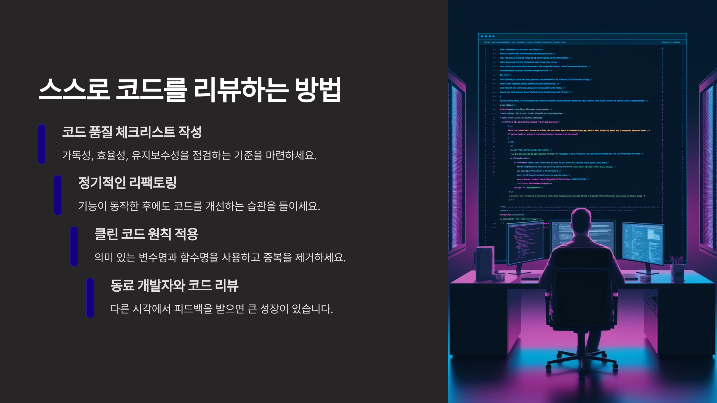 처음에는 간단한 프로젝트부터 시작해서 점점 복잡한 프로젝트로 발전시키는 것이 좋아요. 다음은 **스스로 코드를 리뷰하는 방법**을 알아볼게요! 🔍
