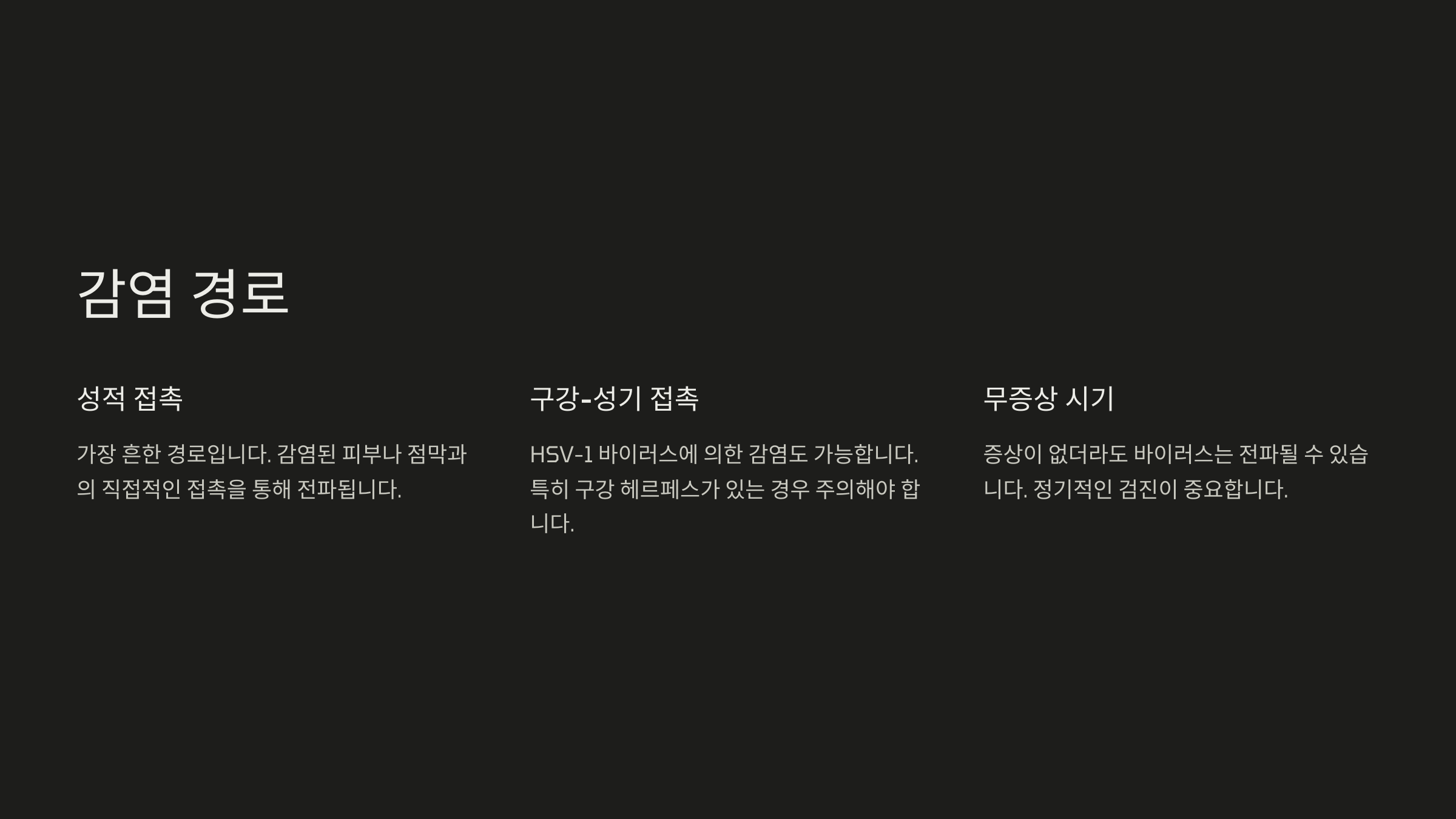 - 👄 구강 성교 (HSV-1 감염자가 구강 성교 시 전파 가능)