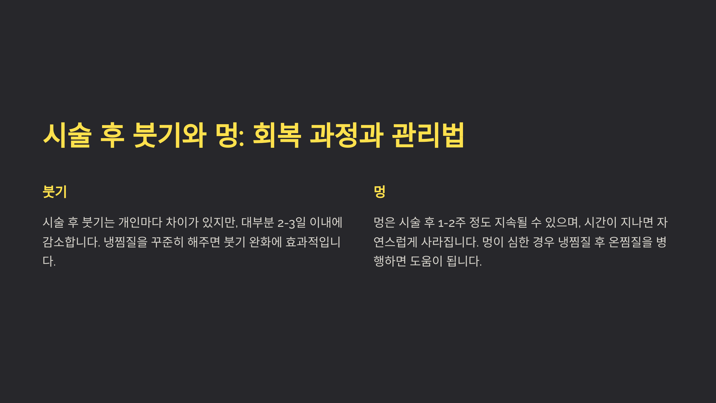 붓기는 보통 시술 후 3~5일 차에 가장 심해지고, 1~2주 내에 점차 가라앉아요. 멍은 개인차가 있지만 약 2주 정도면 거의 사라진답니다. 특히 멍이 심한 경우라면 초기에는 냉찜질을, 이후에는 온찜질을 하면 회복 속도를 높일 수 있어요. 🍀