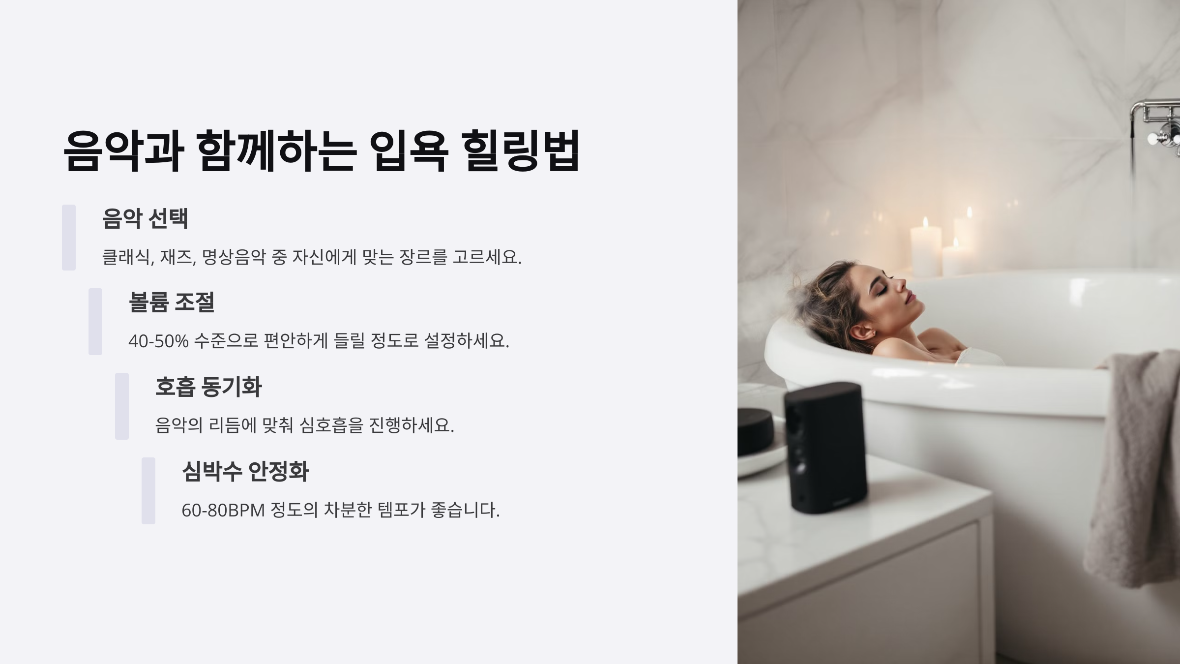 이제 좋은 향기와 따뜻한 물에 몸을 담그며 음악으로 감성을 더해볼 차례예요. 다음은 ‘음악과 함께하는 입욕 힐링법’으로 이어집니다🎶