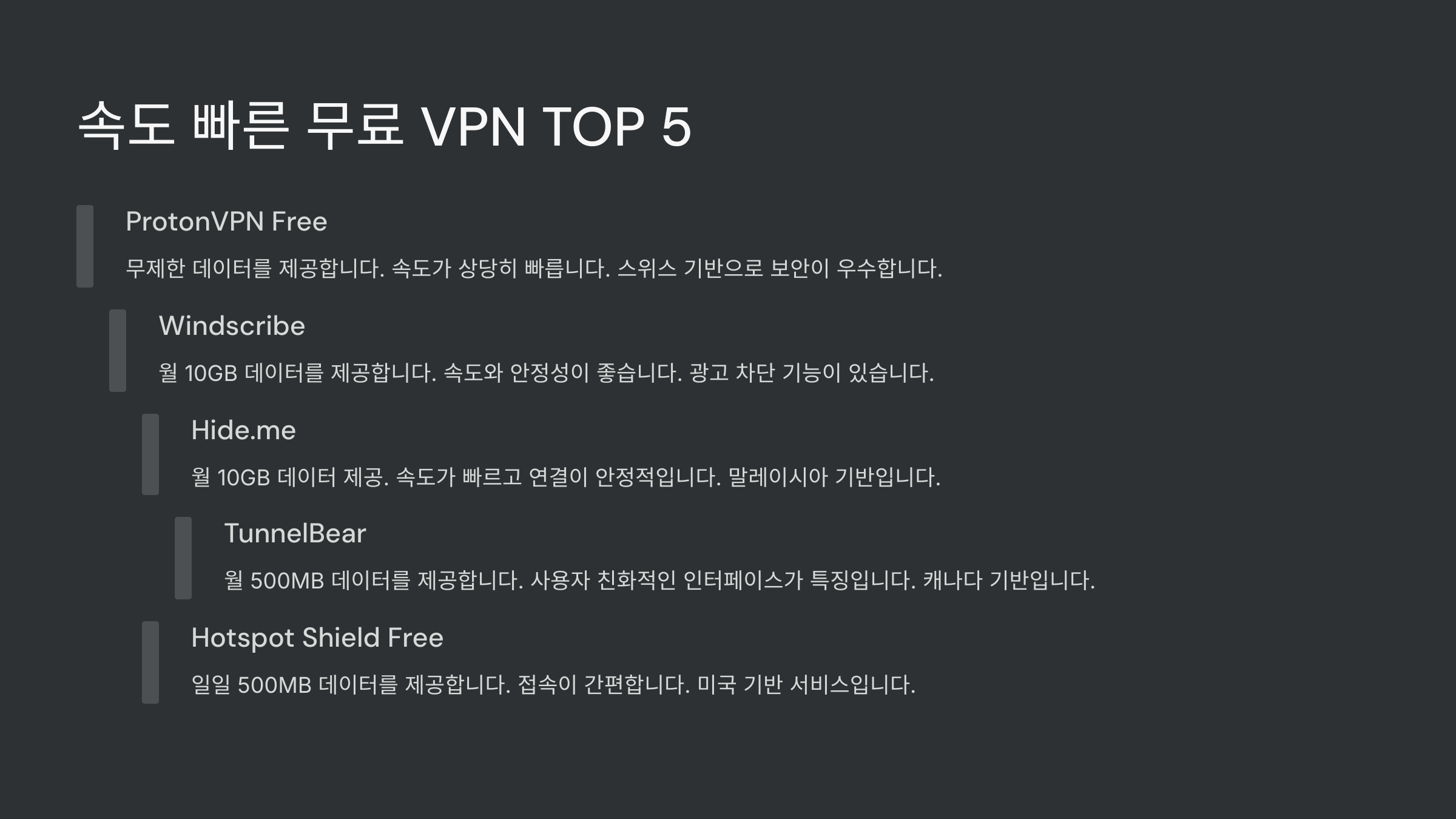 이제 어떤 VPN을 선택해야 할지 감이 오죠? 😉 하지만 모든 무료 VPN이 같은 건 아니에요! 다음 섹션에서 가장 빠르고 신뢰할 수 있는 무료 VPN 5가지를 추천해 드릴게요. 🚀