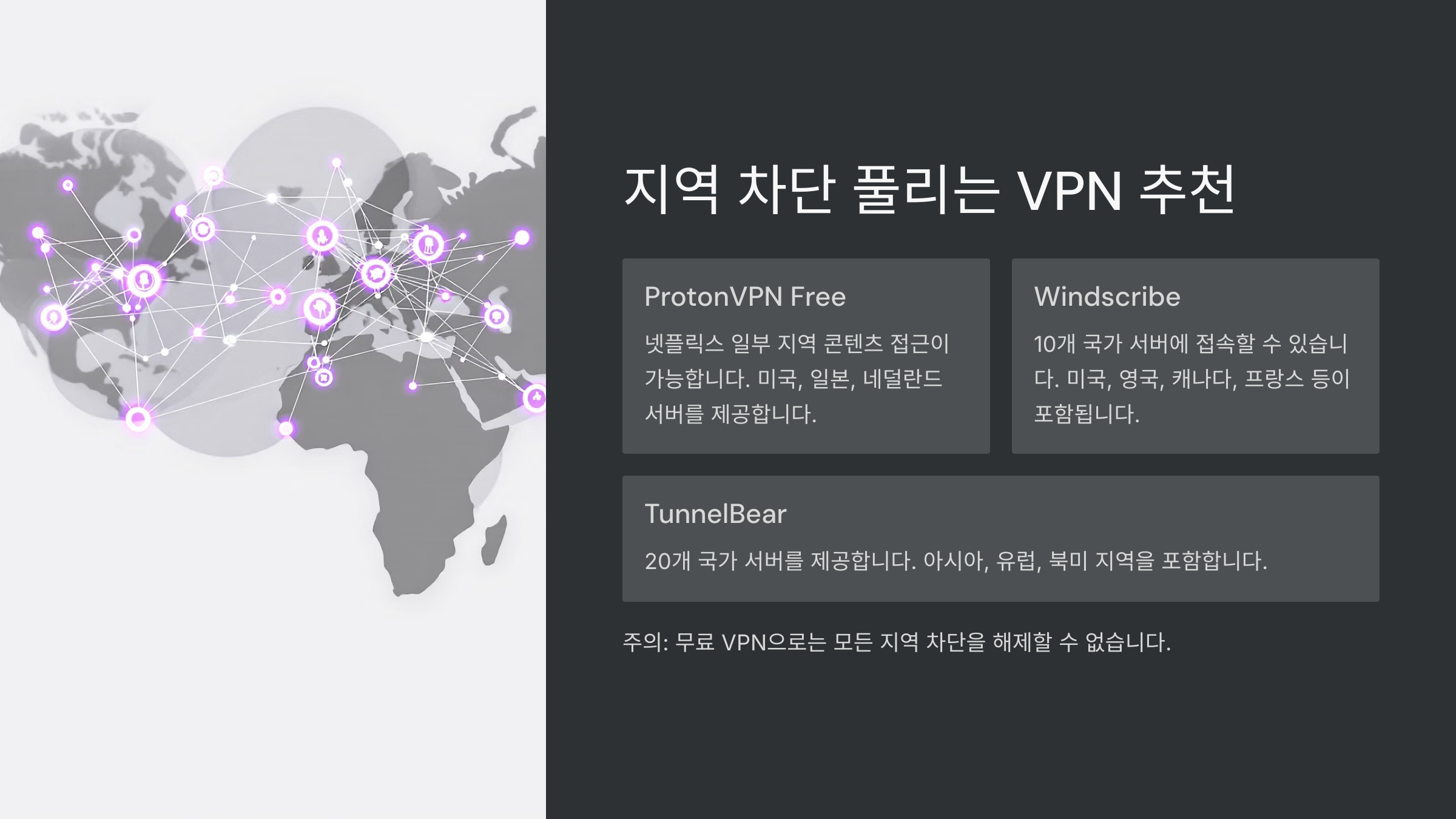 위 VPN들은 무료이지만 지역 차단을 우회하는 데 꽤 효과적이에요. 특히 ProtonVPN과 Windscribe는 속도도 빠르고 넷플릭스 일부 콘텐츠까지 우회 가능해서 추천할 만해요! 🍿
