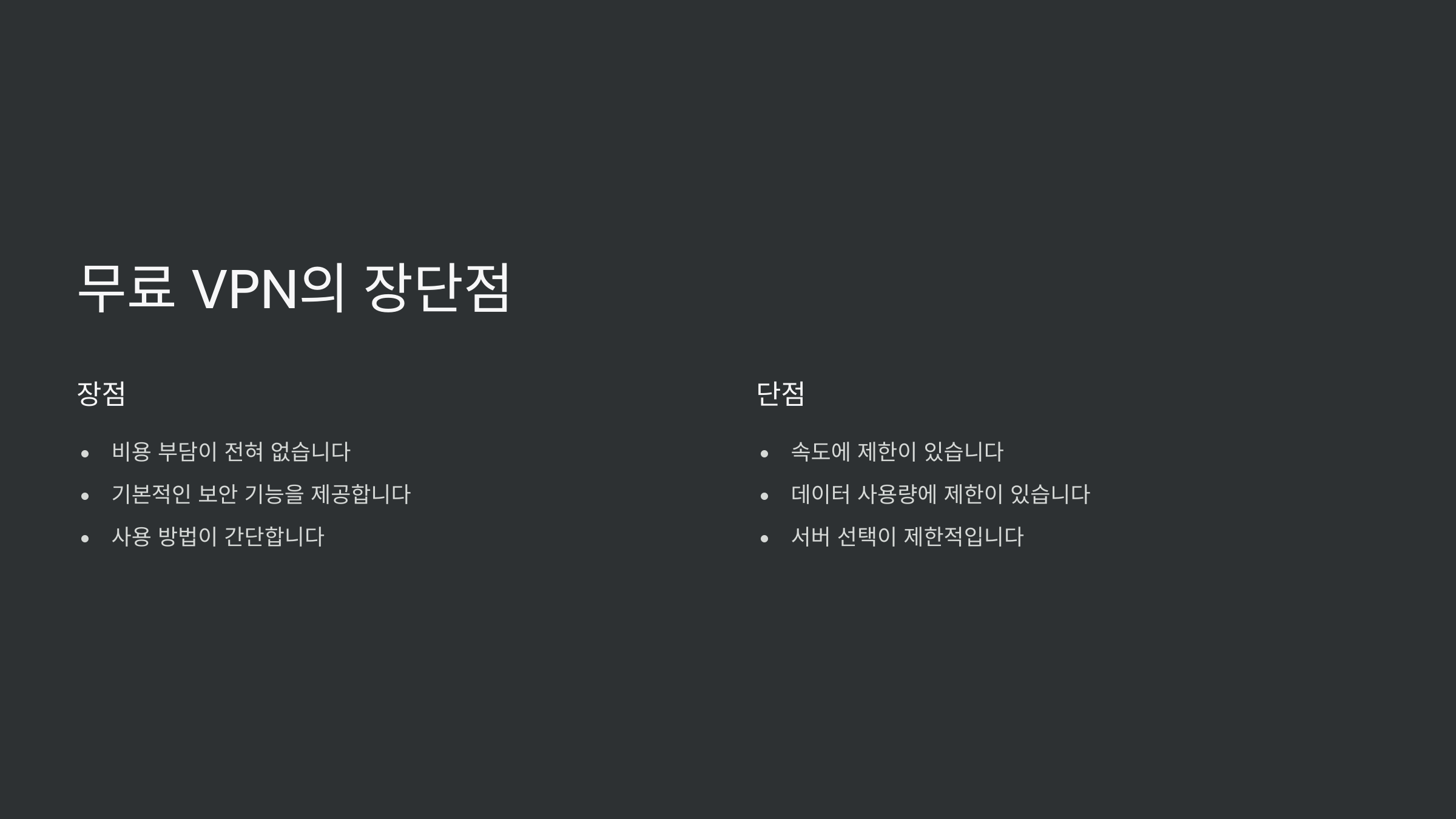 | 🐢 느린 속도 | 무료 VPN은 사용자가 많아서 속도가 느릴 수 있어요. |