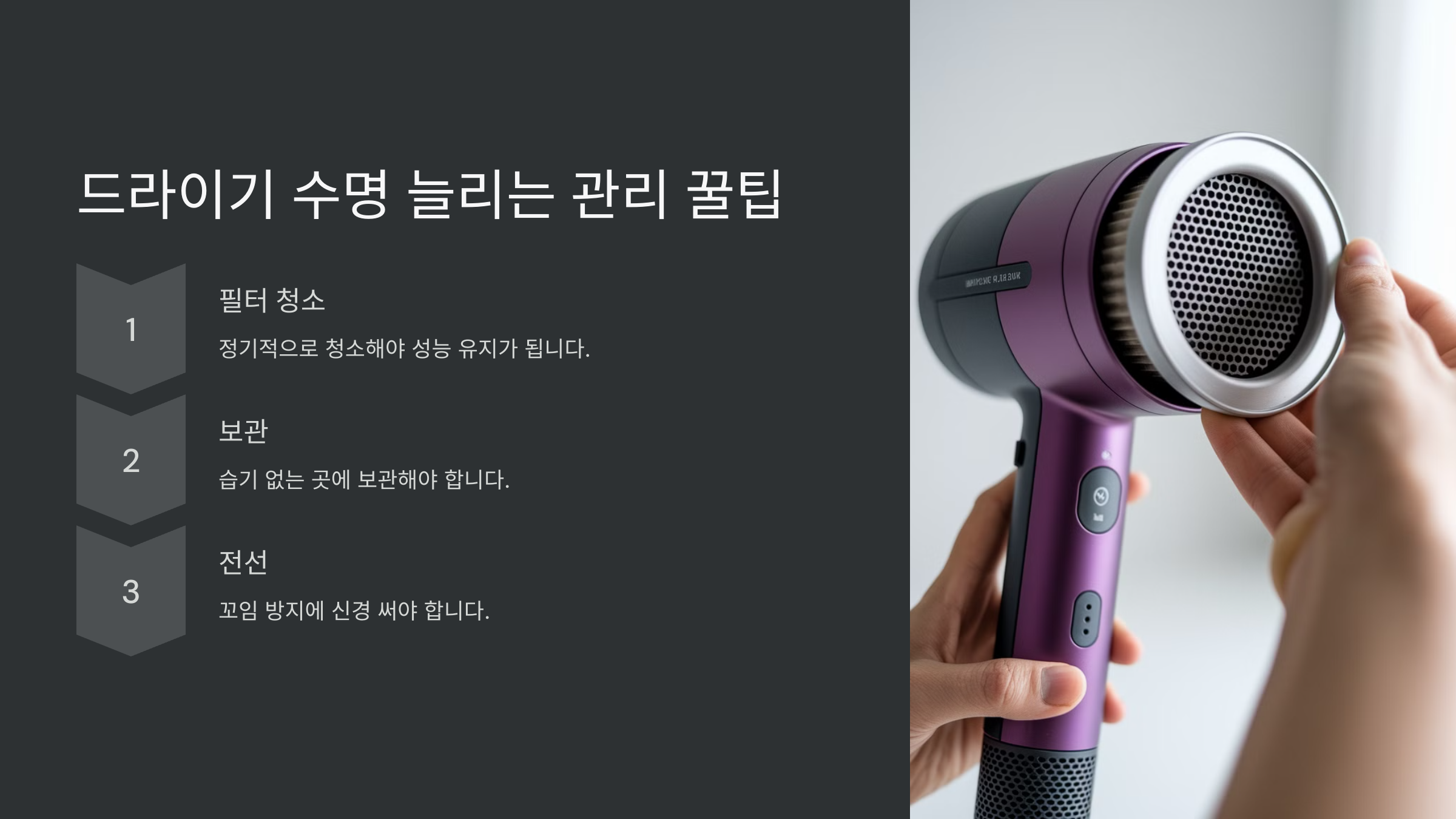 좋은 드라이기를 구매했다면 오랫동안 최상의 상태로 유지하는 것도 중요해요! 드라이기는 관리만 잘해도 성능이 오래 유지될 수 있어요. 🛠️